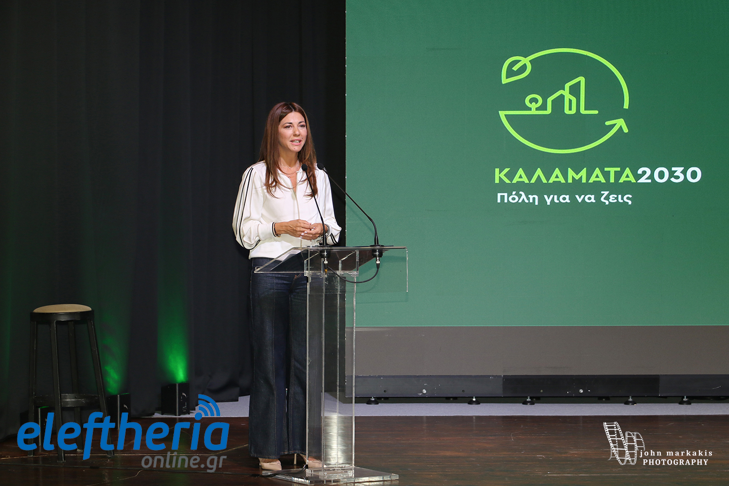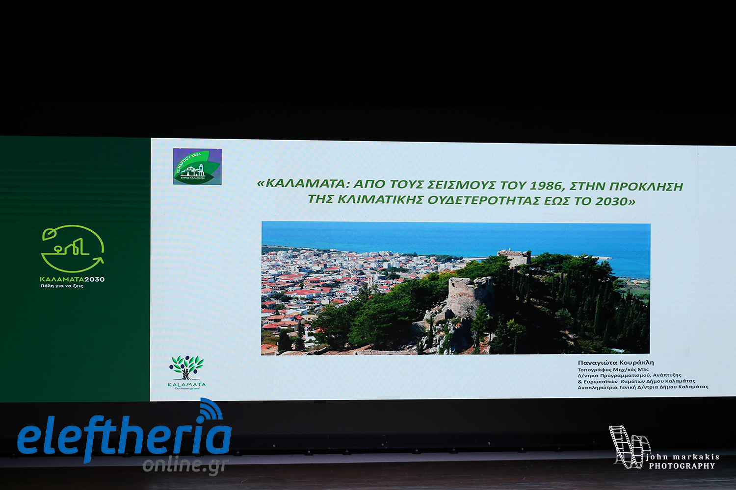 Η γενική διευθύντρια του Δήμου Καλαμάτας Παναγιώτα Κουράκλη αναφέρθηκε στην πορεία ανασυγκρότησης της Καλαμάτας μετά τους σεισμούς του 1986 και στάθηκε στη συμμετοχή της Παγκόσμιας Τράπεζας και στο κλιματικό κοινωνικό συμβόλαιο.