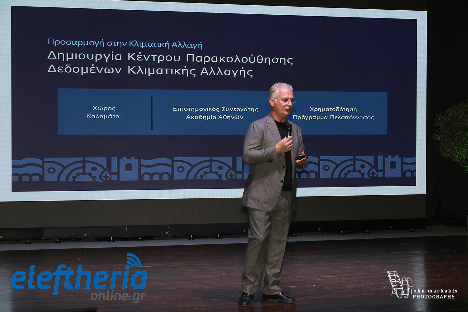Ο επιστημονικός συνεργάτης του δημάρχου αναφέρθηκε στις επιπτώσεις της κλιματικής αλλαγής, στην παρατεταμένη ξηρασία, στις πλημμύρες, τις φωτιές κι επισήμανε ότι στην Καλαμάτα έχει αυξηθεί η θερμοκρασία κατά ένα βαθμό σε σχέση με το 2000 και πως η δεκαετία του 2010 ήταν η πιο θερμή δεκαετία από το 1850.