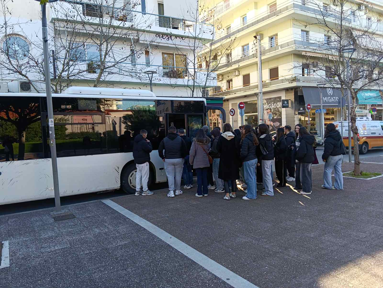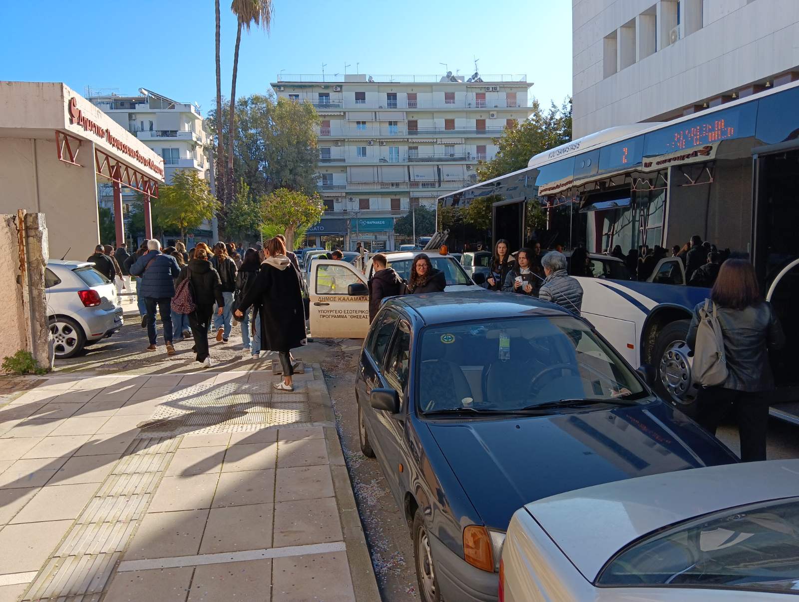 Κάποια στιγμή ασυνείδητος οδηγός διπλοπάρκαρε στη Δημοσθένους μεταξύ ΔΗΠΕΘΕΚ και Δικαστικού Μεγάρου (παράτησε το αυτοκίνητό του και ίσα που χωρούσε να περάσει ΙΧ) και το λεωφορείο του Αστικού προς το Πανεπιστήμιο φράκαρε, σταμάτησε εκεί. Είκοσι περίπου φοιτητές κατέβηκαν και με παρέμβαση του προέδρου του Αστικού Θανάση Πατικόπουλου (βρισκόταν στην περιοχή για να δει την κίνηση των μεγάλων λεωφορείων στην στροφή προς τη Δημοσθένους), πήγαν στην Αριστομένους, όπου περίμεναν άλλο λεωφορείο που ήρθε και τους μετέφερε στο Πανεπιστήμιο.