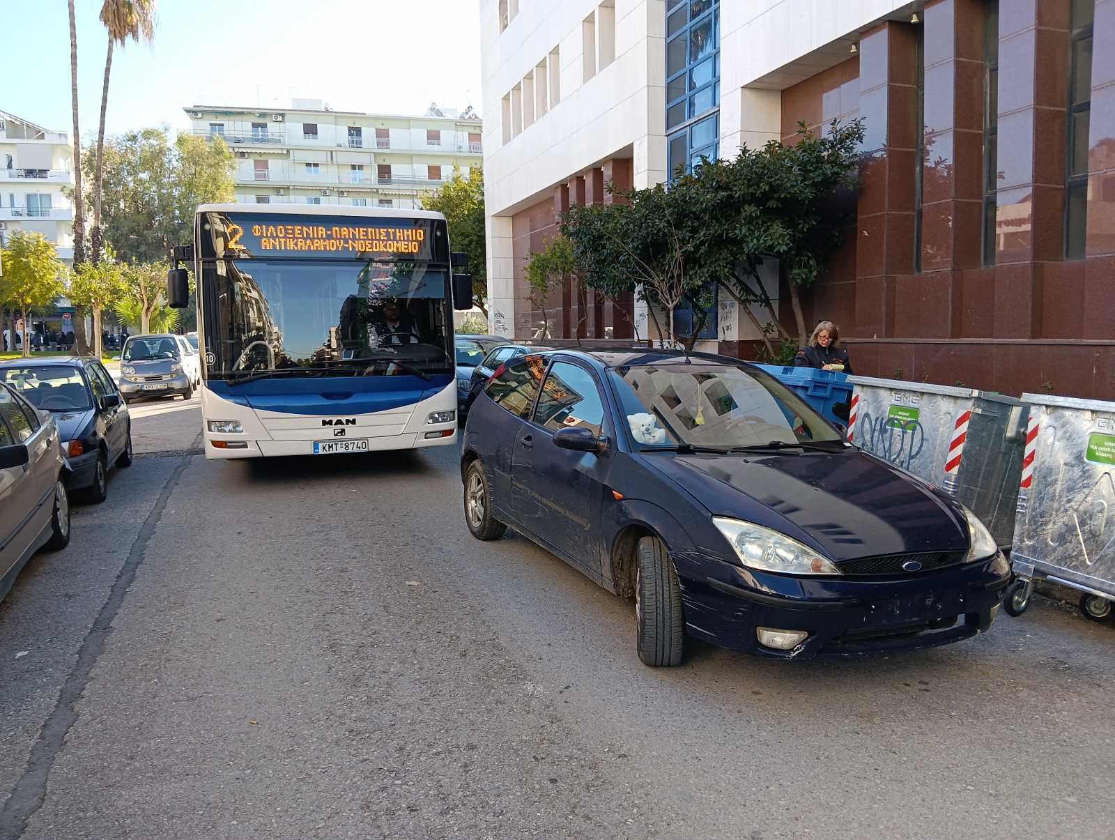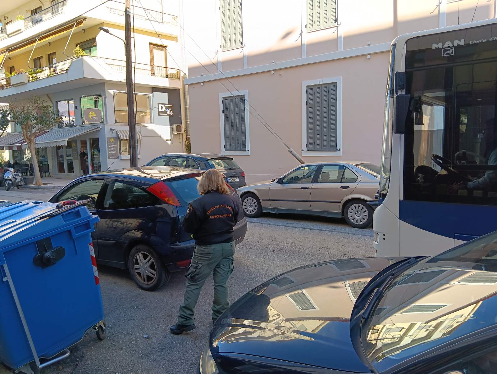 Δημοτική αστυνομικός που έσπευσε, έκοψε κλήση στο παράνομα παρκαρισμένο αυτοκίνητο και του αφαίρεσε τις πινακίδες. Ολο αυτό το διάστημα και μέχρι ο οδηγός του να το μετακινήσει, η κίνηση των λεωφορείων και όλων των οχημάτων προς τα δυτικά, διεξαγόταν μέσω της Μακεδονίας!