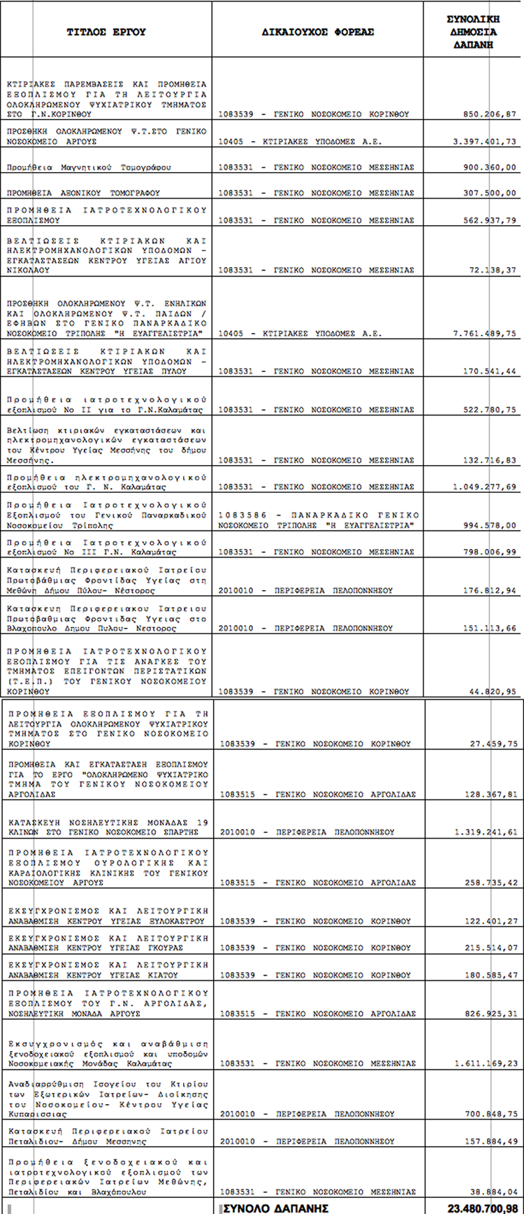 Απ’ την άλλη πλευρά η Περιφέρεια έχει παρέμβει καθολικά στον τομέα της υγείας στην Πελοπόννησο με παρεμβάσεις τόσο σε νοσοκομειακές μονάδες, κέντρα υγείας, περιφερειακά ιατρεία, όσο και σε νοσοκομειακό εξοπλισμό, παρότι όταν ανέλαβε την πρωτοβουλία να επενδύσει πόρους από το συγχρηματοδοτούμενο πρόγραμμά της κανένας δεν πίστευε ότι θα τα καταφέρει με τέτοια επιτυχία. Η περιφερειακή αρχή αξιοποίησε μάλιστα και πόρους από το Πρόγραμμα Δημοσίων Επενδύσεών της, ύψους 4 εκατομμυρίων ευρώ για το σκοπό αυτό. Επισυνάπτεται αναλυτικός πίνακας (με τα έργα που έχουν ήδη υλοποιηθεί, ενταχθεί, είναι υπό ένταξη και υπό αξιολόγηση και τα οποία αποδεικνύουν το σπουδαίο έργο που έχει επιτευχθεί.