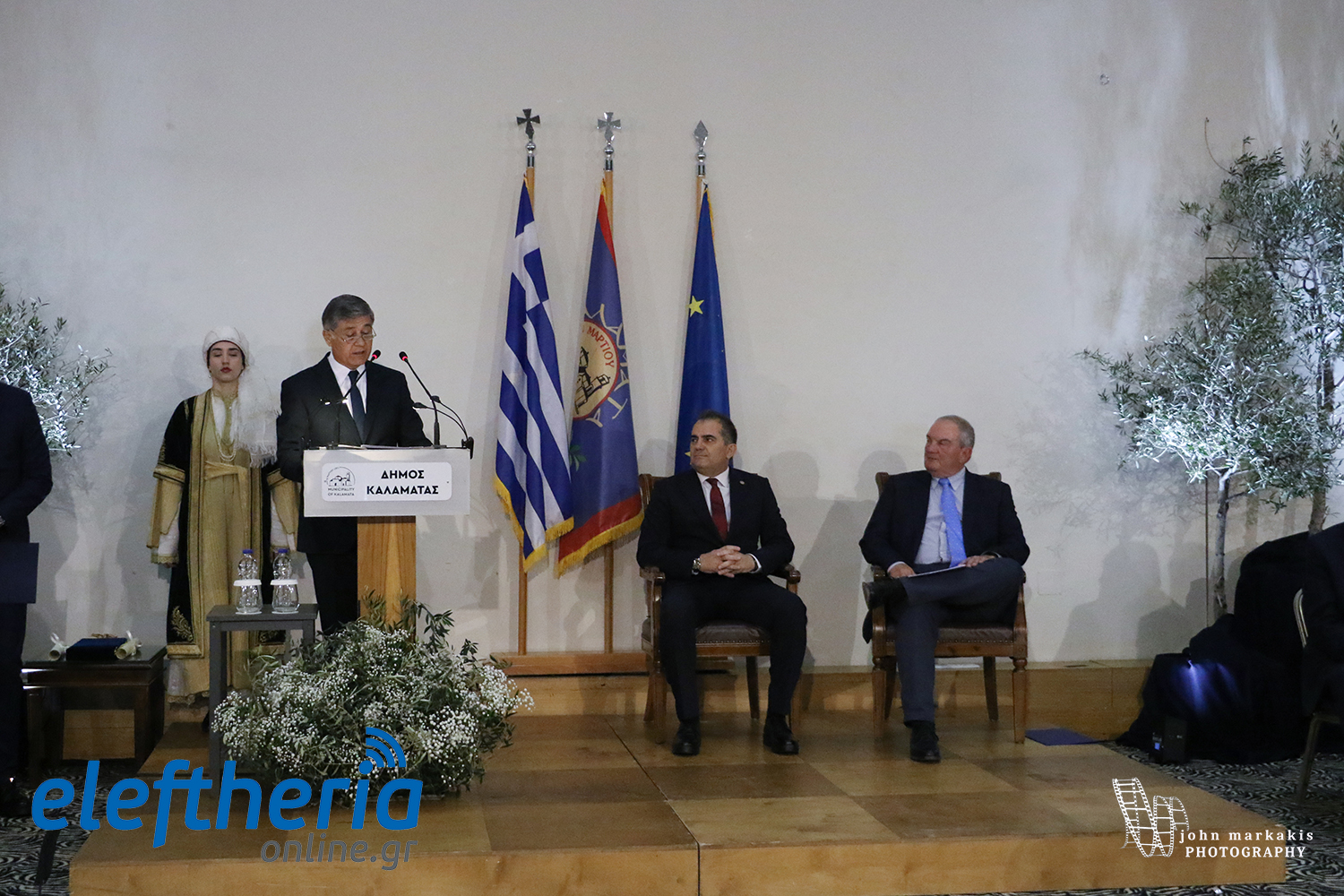 Στην προσφώνησή του ο δήμαρχος Θαν. Βασιλόπουλος, αναφερόμενος στον Κ. Καραμανλή, είπε, μεταξύ άλλων, ότι “η ανακήρυξή σας ως επίτιμου δημότη του Δήμου Καλαμάτας αποτελεί, πρωτίστως, μια πράξη θεσμικής αναγνώρισης της προσφοράς σας προς την πατρίδα.