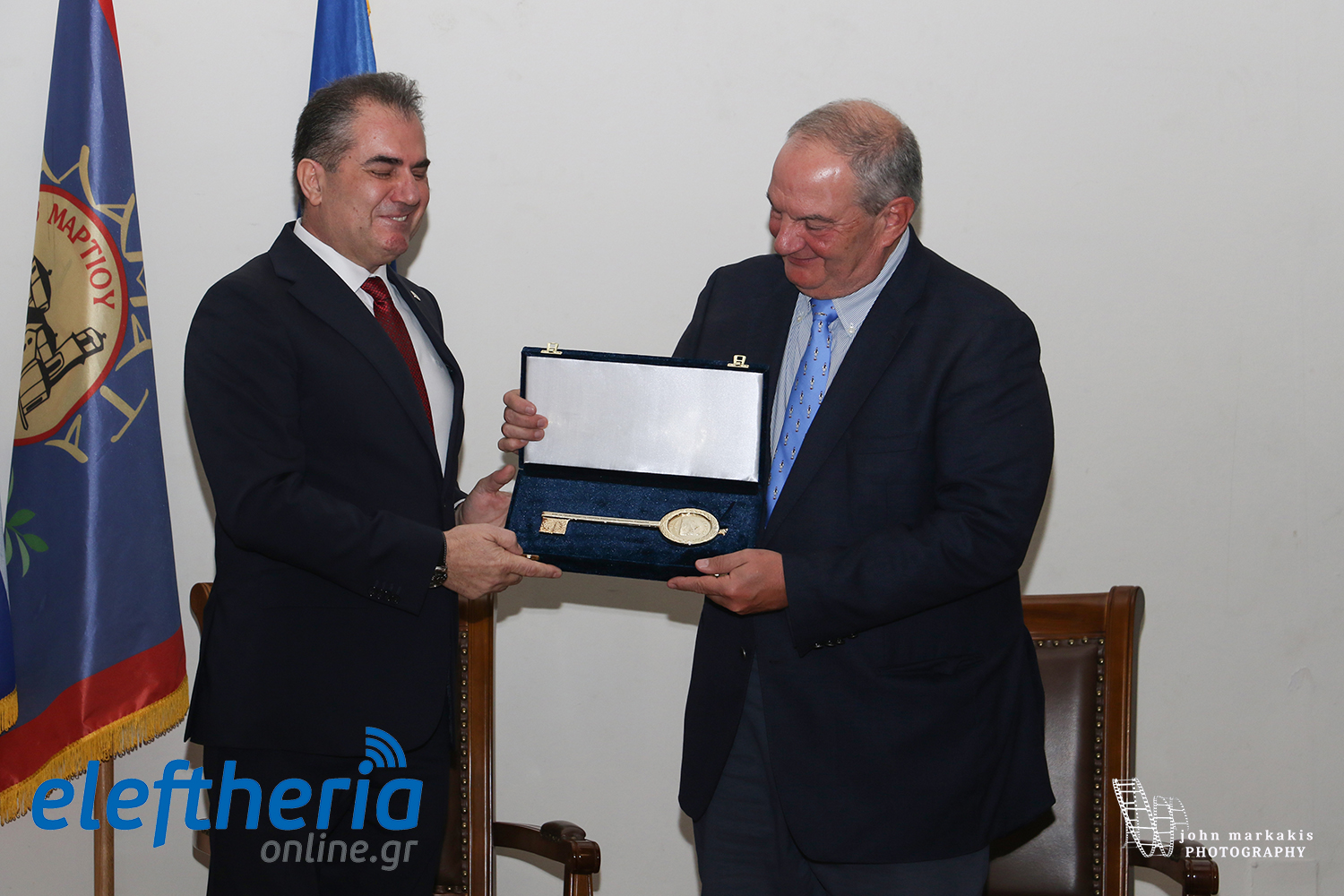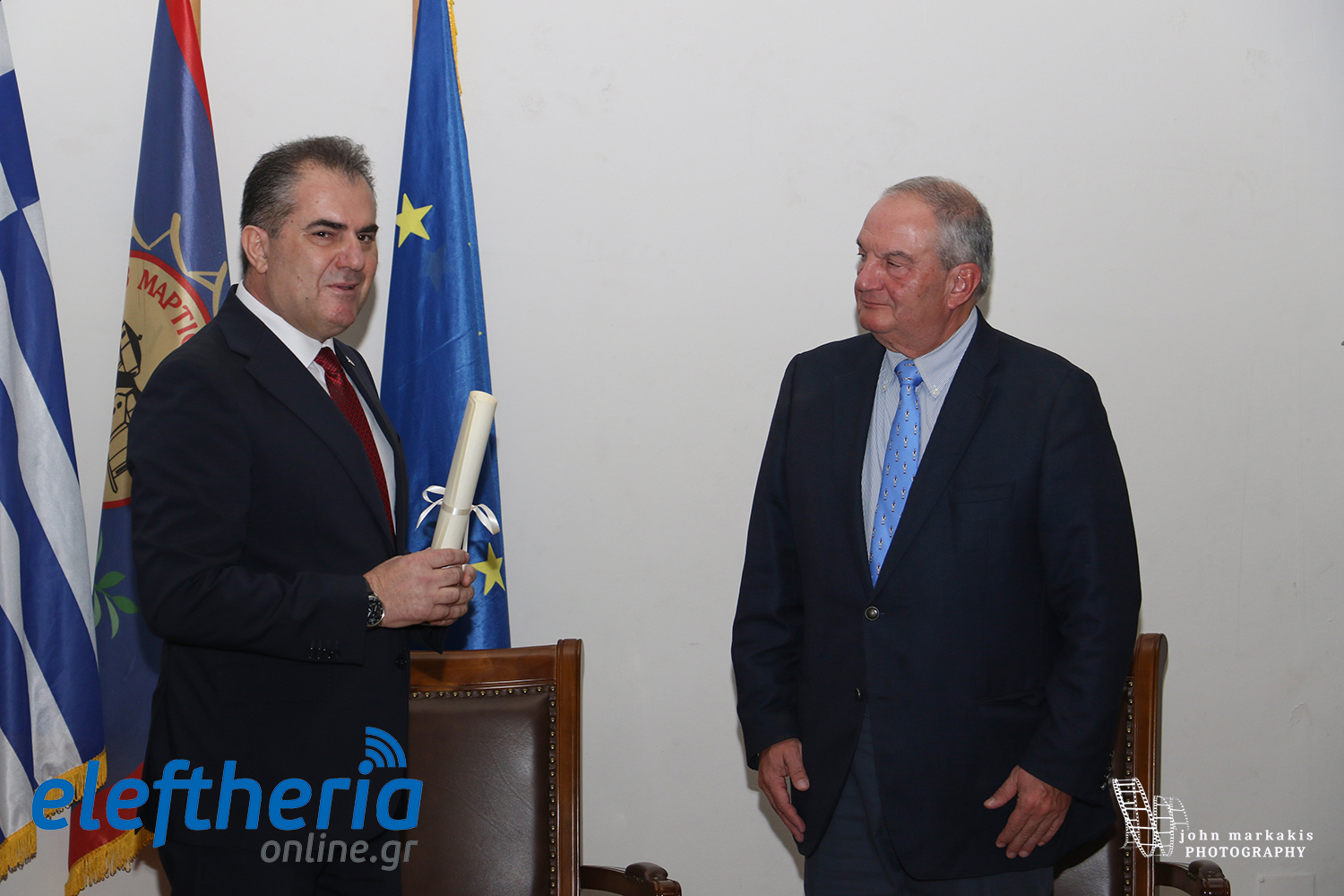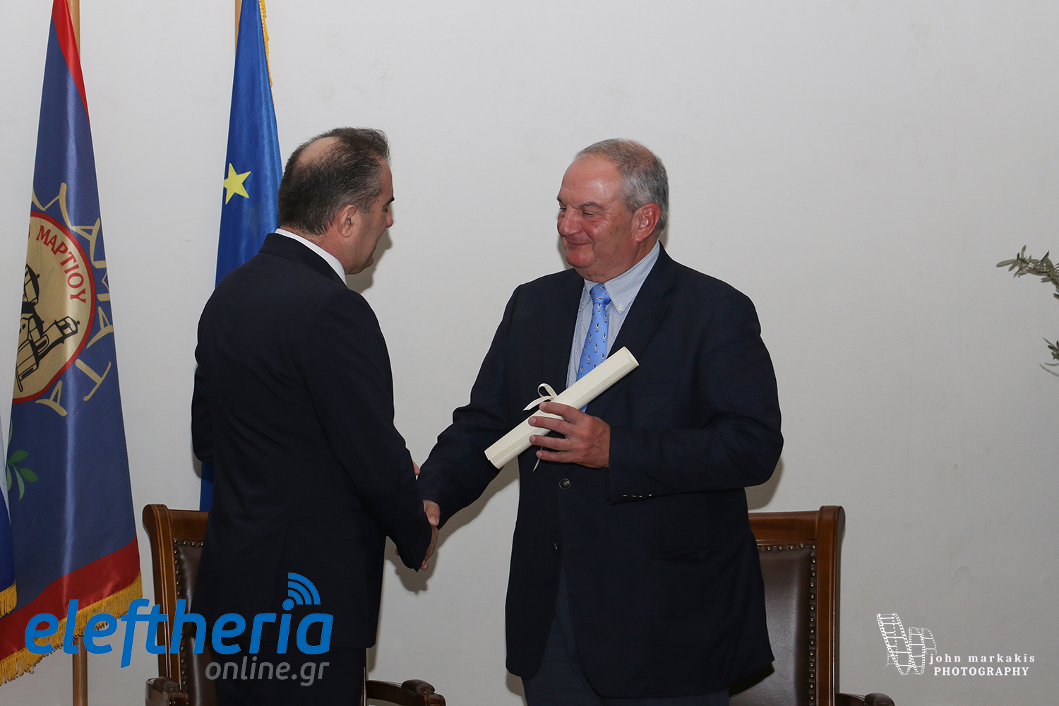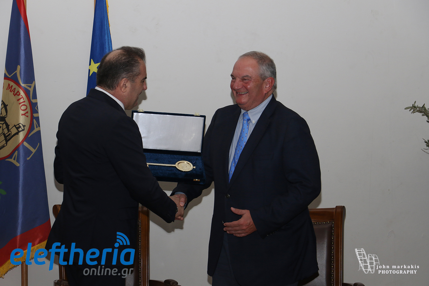 Ο πρόεδρος επέδωσε στον πρώην πρωθυπουργό το ψήφισμα της ανακήρυξης και ο δήμαρχος Καλαμάτας Θανάσης Βασιλόπουλος το χρυσό κλειδί της πόλης και τη Διακήρυξη της Μεσσηνιακής Γερουσίας προς τις Ευρωπαϊκάς Αυλάς.