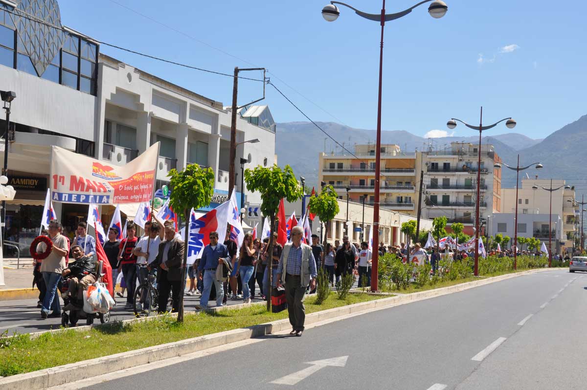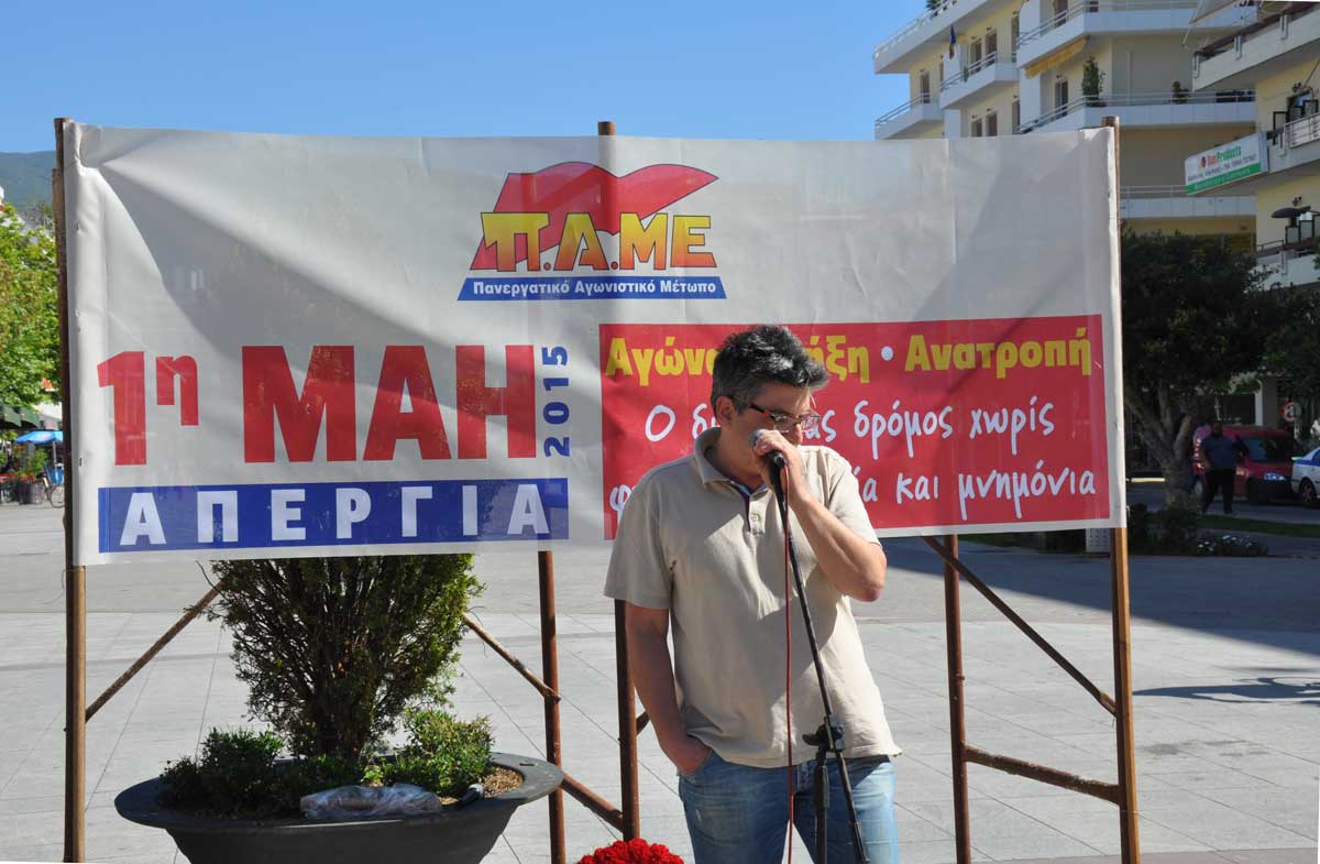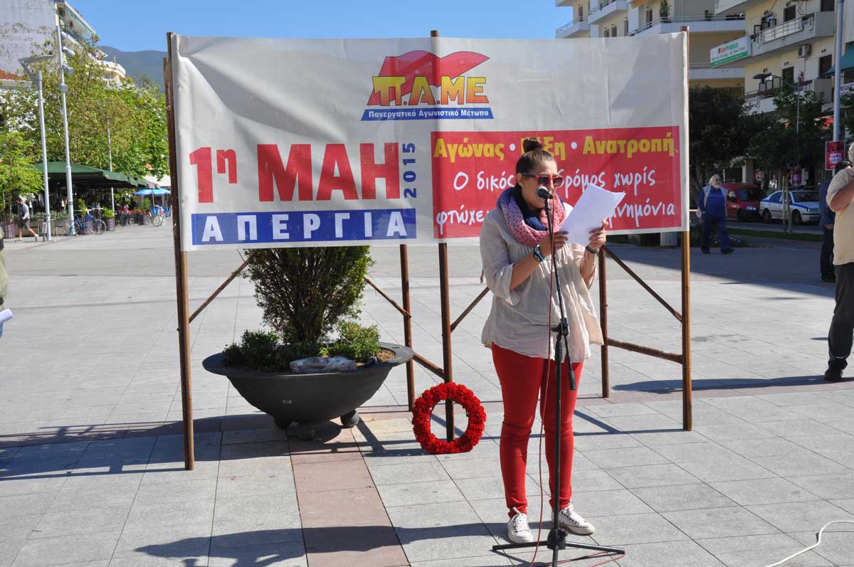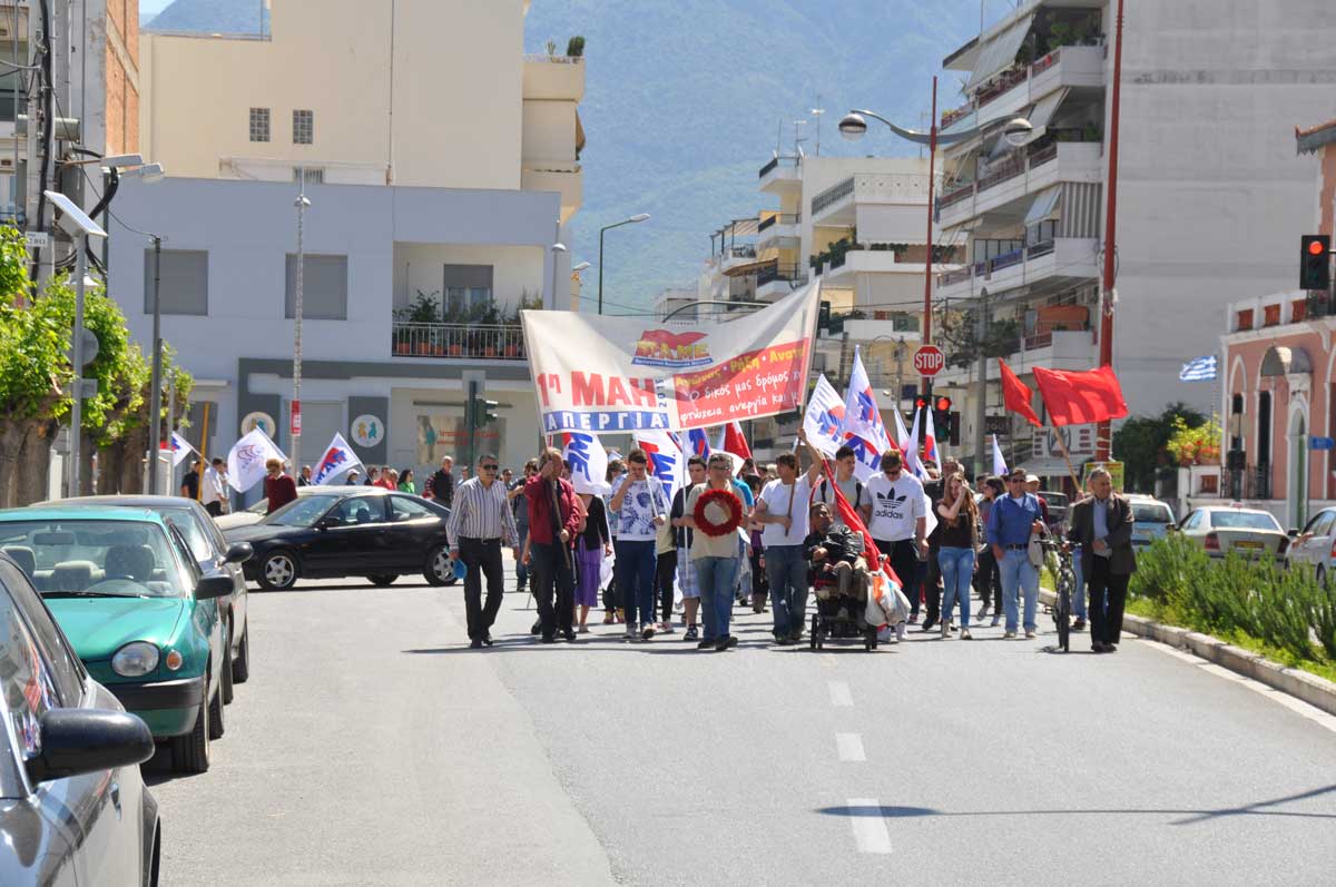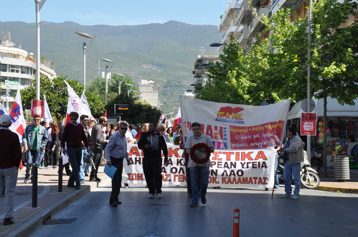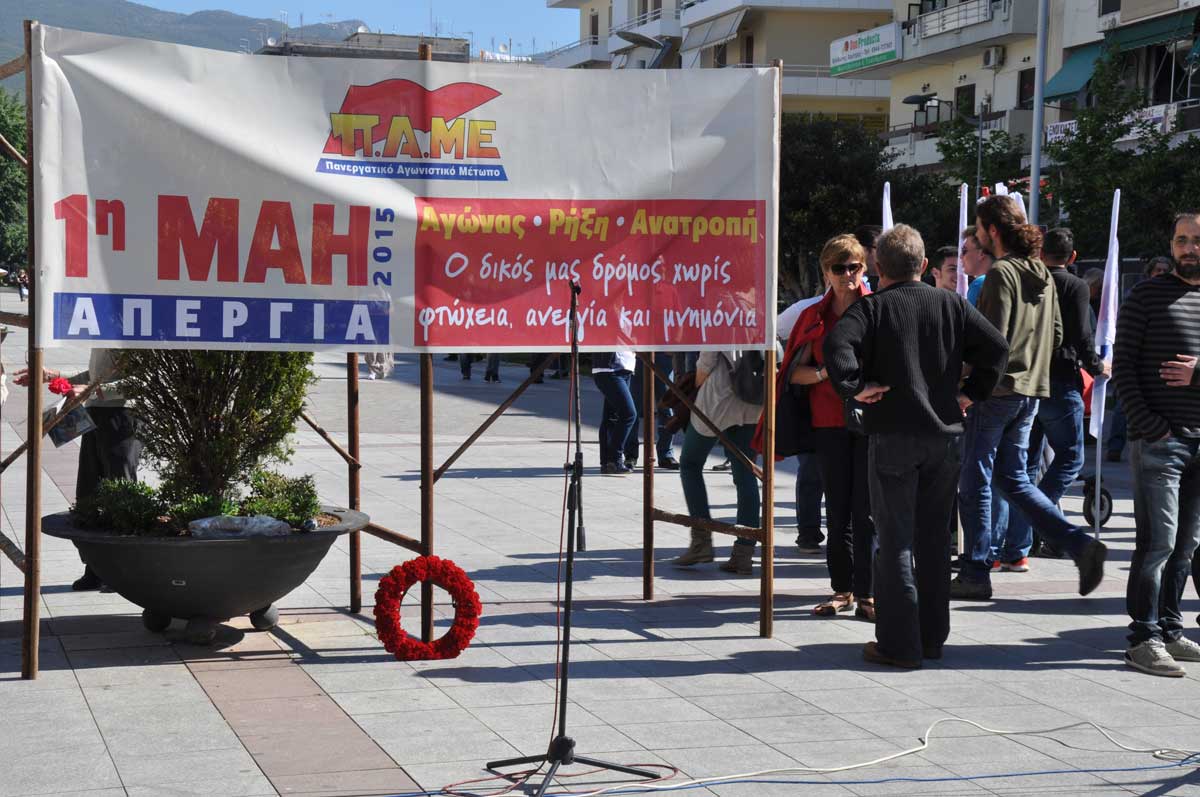 Στους συγκεντρωμένους απευθύνθηκαν, ο Μάριος Μούντανος από την Επιτροπή Ανέργων -ο οποίος και κατέθεσε, αργότερα, το στεφάνι στο μνημείο των λιμενεργατών-, ο ειδικευόμενος γιατρός στο Νοσοκομείο Καλαμάτας Γιώργος Φερνετίνος και ο επικεφαλής της Γραμματείας Μεσσηνίας του ΠΑΜΕ Παναγιώτης Κουφαλάκος, πρόεδρος του σωματείου εργαζομένων στη ΔΕΥΑΚ, ενώ η Βάσια Αντωναροπούλου ανέγνωσε την απολογία του Αύγουστου Σπάις, του εργάτη που μαζί με άλλους συναδέλφους του απαγχονίστηκε για τα γεγονότα που εξελίχθηκαν στην εργατική κινητοποίηση του Σικάγου το 1886.