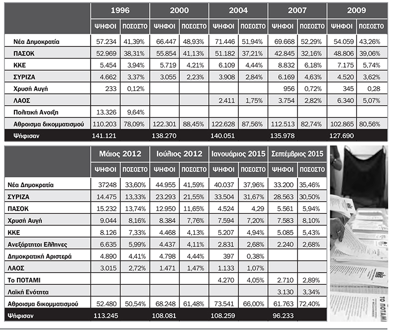 Συγκεκριμένα και σύμφωνα με τα επίσημα στοιχεία του υπουργείου Εσωτερικών, στις εκλογές του 1996 προσήλθαν στις κάλπες 141.121 ψηφοφόροι, ενώ 19 χρόνια αργότερα, το Σεπτέμβριο του 2015, σε μια κρίσιμη για το μέλλον της Ελλάδας αναμέτρηση ψήφισαν μόνο 96.233 Μεσσήνιοι ψηφοφόροι. Αξίζει να σημειωθεί ότι το Σεπτέμβριο του 2015 στη Μεσσηνία ψήφισαν για πρώτη φορά λιγότεροι από 100.000, ενώ στις πρόσφατες ευρωεκλογές του Μαΐου ψήφισαν 102.640 Μεσσήνιοι.