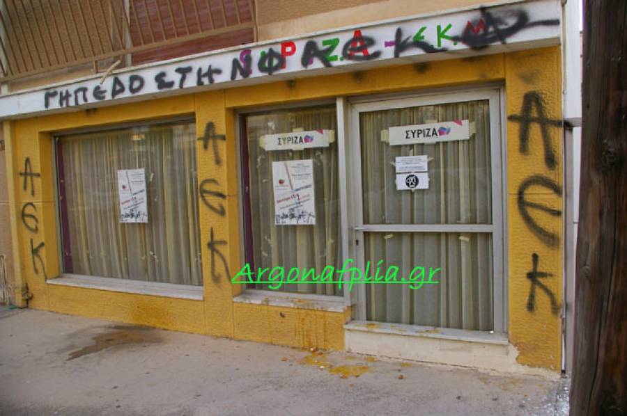 Άγνωστοι πέταξαν αυγά στα γραφεία του ΣΥΡΙΖΑ επί της οδού Αιγίου στο Ναύπλιο.