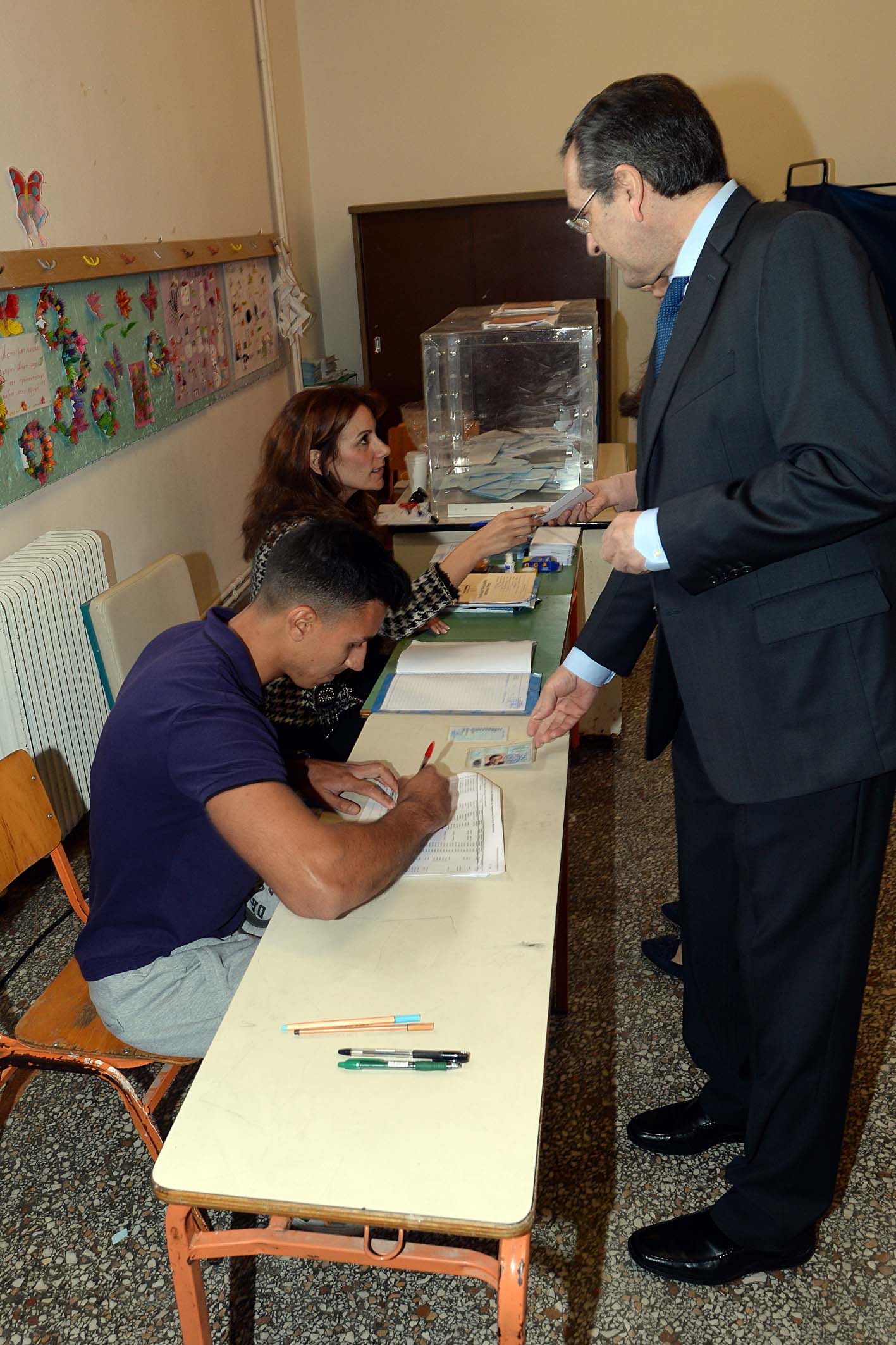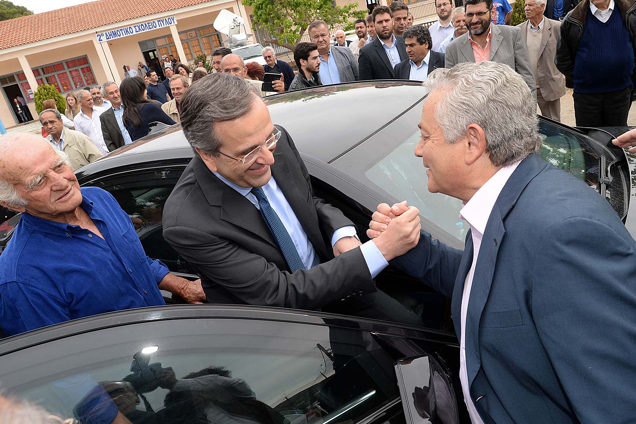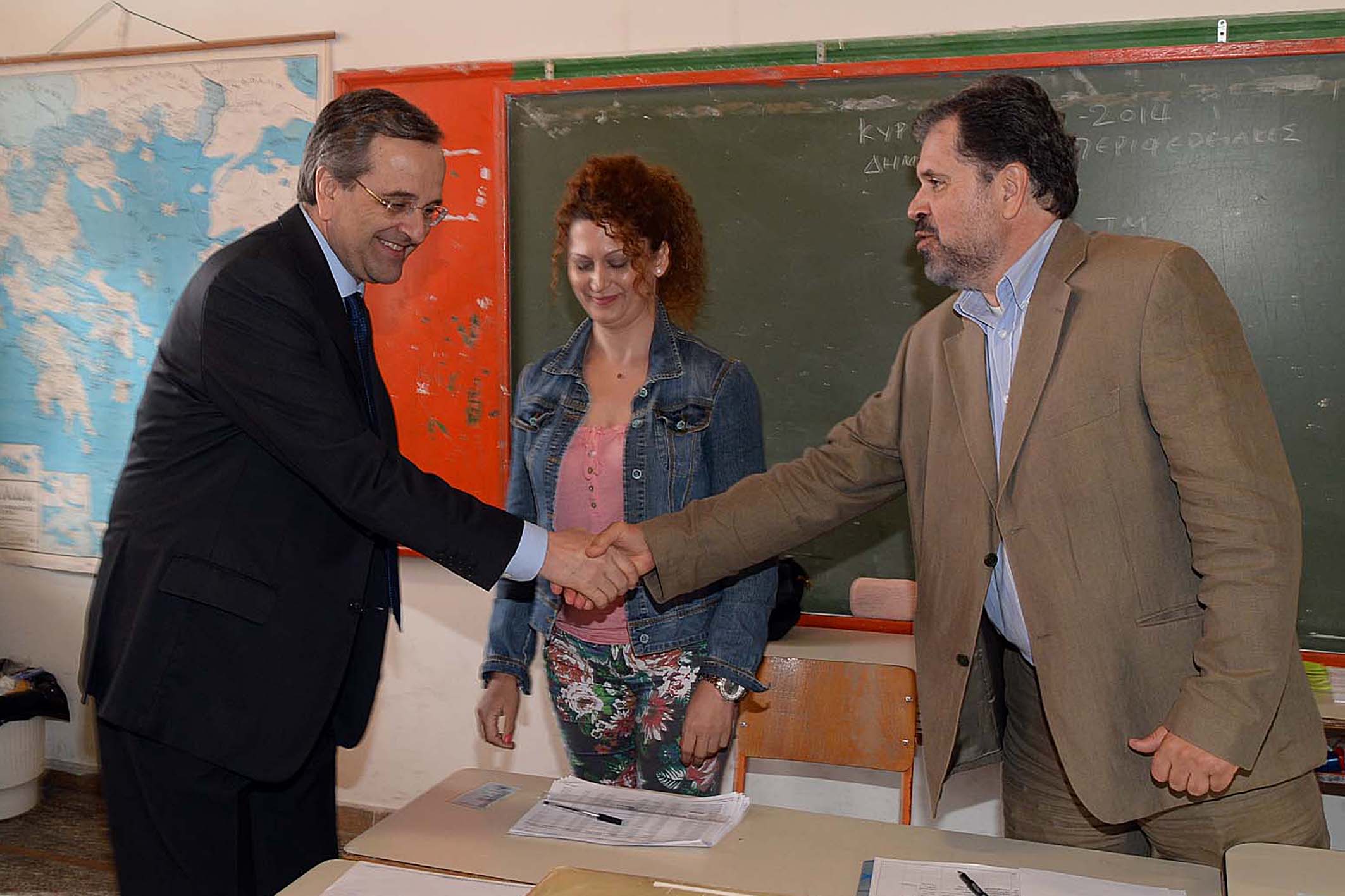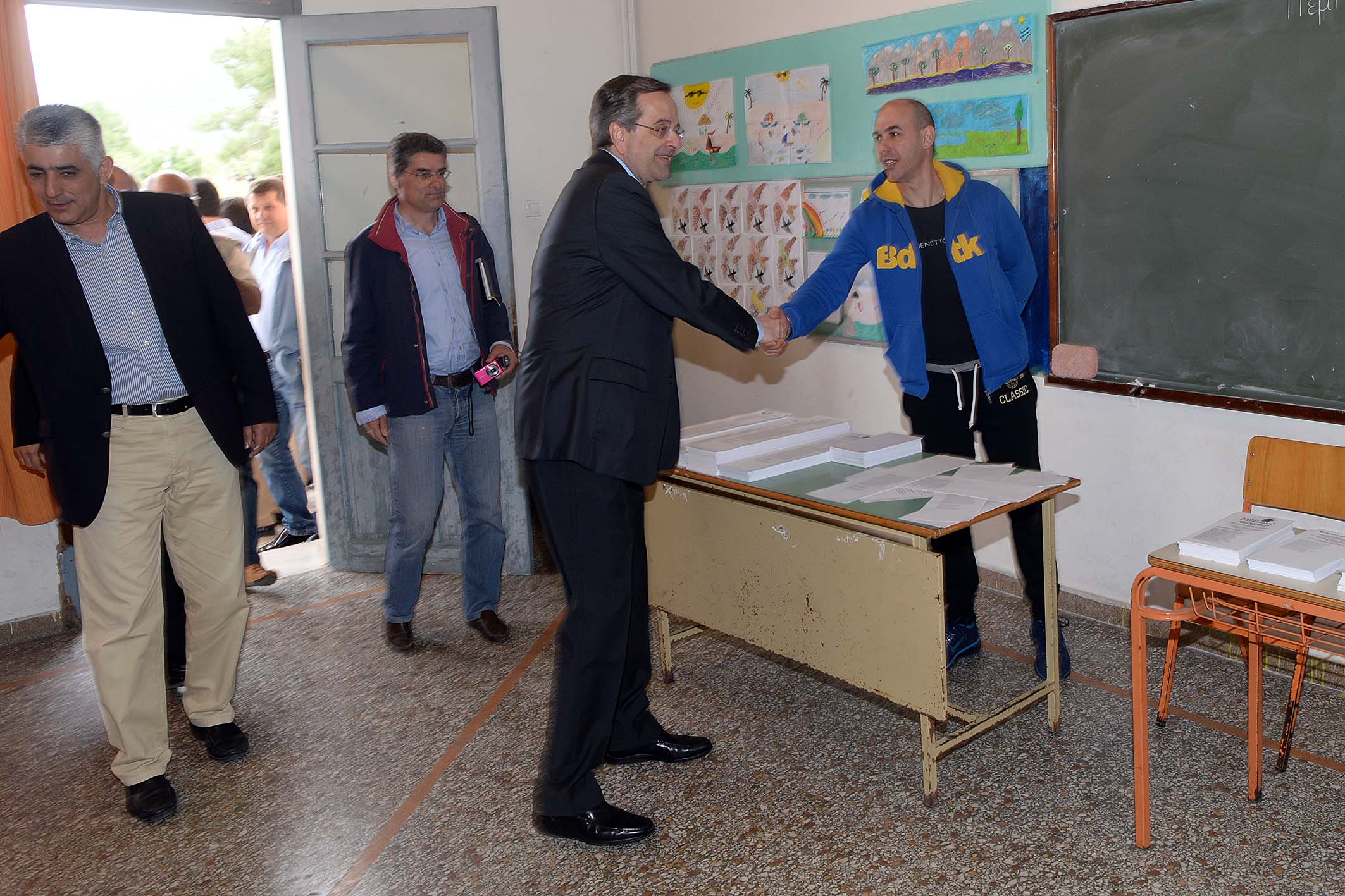 Λίγο πριν αποχωρήσει πέρασε από όλα τα εκλογικά τμήματα στο 1ο και 2ο Δημοτικό Σχολείο, όπου χαιρέτησε όλα τα μέλη της εφορευτικής επιτροπής και τους δικαστικούς αντιπροσώπους, ενώ φωτογραφήθηκε τόσο με τους νεολάιους, όσο και με τους... παλαίμαχους του κόμματος. Στη συνέχεια αναχώρησε για την Αθήνα.