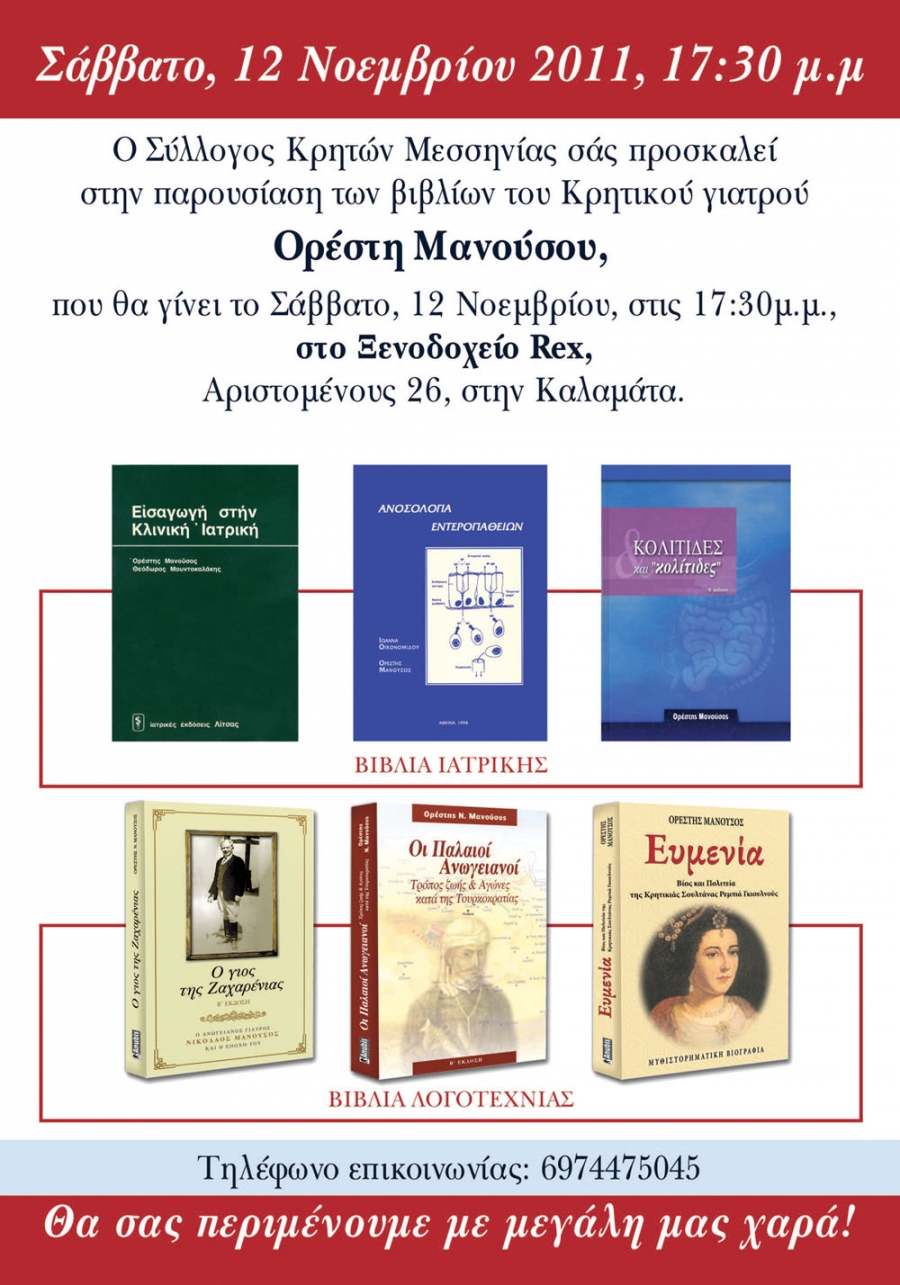 Ο Σύλλογος Κρητών Μεσσηνίας «Ο Ψηλορείτης», διοργανώνει εκδήλωση με θέμα την παρουσίαση των βιβλίων του κρητικού γιατρού και συγγραφέα Ορέστη Μανούσου, το Σάββατο 12 Νοεμβρίου 2011 και ώρα 17:30, στο ξενοδοχείο Rex.
