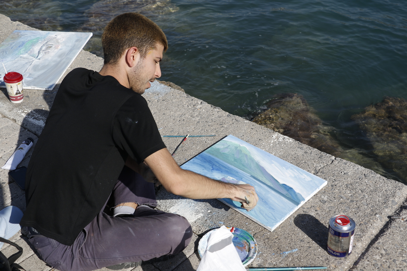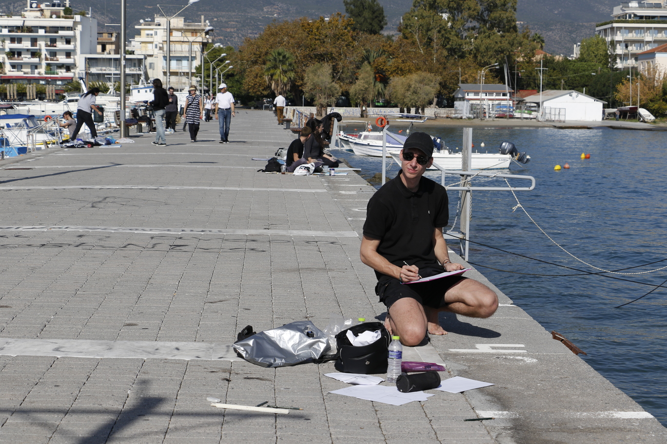 Από τους σπουδαστές - ζωγράφους ο Σπύρος παρατήρησε ότι “ο καθένας δημιουργεί με το δικό του τρόπο. Στόχος είναι να περάσουμε καλά, γιατί έτσι θα βγει και κάτι ωραίο”. Μας ενημέρωσε ότι είναι πρώτη φορά που έρχεται στην Καλαμάτα και δήλωσε εντυπωσιασμένος: “Εχει και βουνό και θάλασσα και νεοκλασικά κτήρια. Με εμπνέει και σήμερα βοηθάει και ο καιρός, γιατί χθες είχε συννεφιά”.
