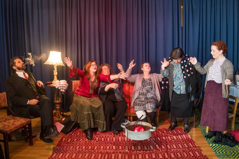 Το έργο είναι μια ηθογραφική κωμωδία που διαπραγματεύεται την ιστορία 5 γυναικών (χήρες όλες) διαφορετικών ηλικιών σε μια βραδινή τους επίσκεψη στο σπίτι της κυρά Καλλιόπης στα Φιλιατρά Μεσσηνίας, όπου συζητούν, αστειεύονται, φιλονικούν και κουτσομπολεύουν αναμασώντας αναμνήσεις από τους μακαρίτες συντρόφους τους και το παρελθόν τους. Με την κουβέντα γύρω από ένα μαγκάλι, βγάζουν στην επιφάνεια το βαθύ συντηρητισμό τους, τη θρησκοληψία τους, τις πολιτικές τους αντιπαραθέσεις με τα μικροσυμφέροντα που τις χαρακτηρίζουν, το άγχος της περασμένης ηλικίας τους και τα αδιέξοδά τους. Κυρίως όμως αποτυπώνεται το πολιτιστικό τους κενό. Ολα αυτά μέχρι που εμφανίζεται στην παρέα τους ένας όμορφος νέος άντρας, ο οποίος θα παίξει καταλυτικό ρόλο στη ζωή τους…
