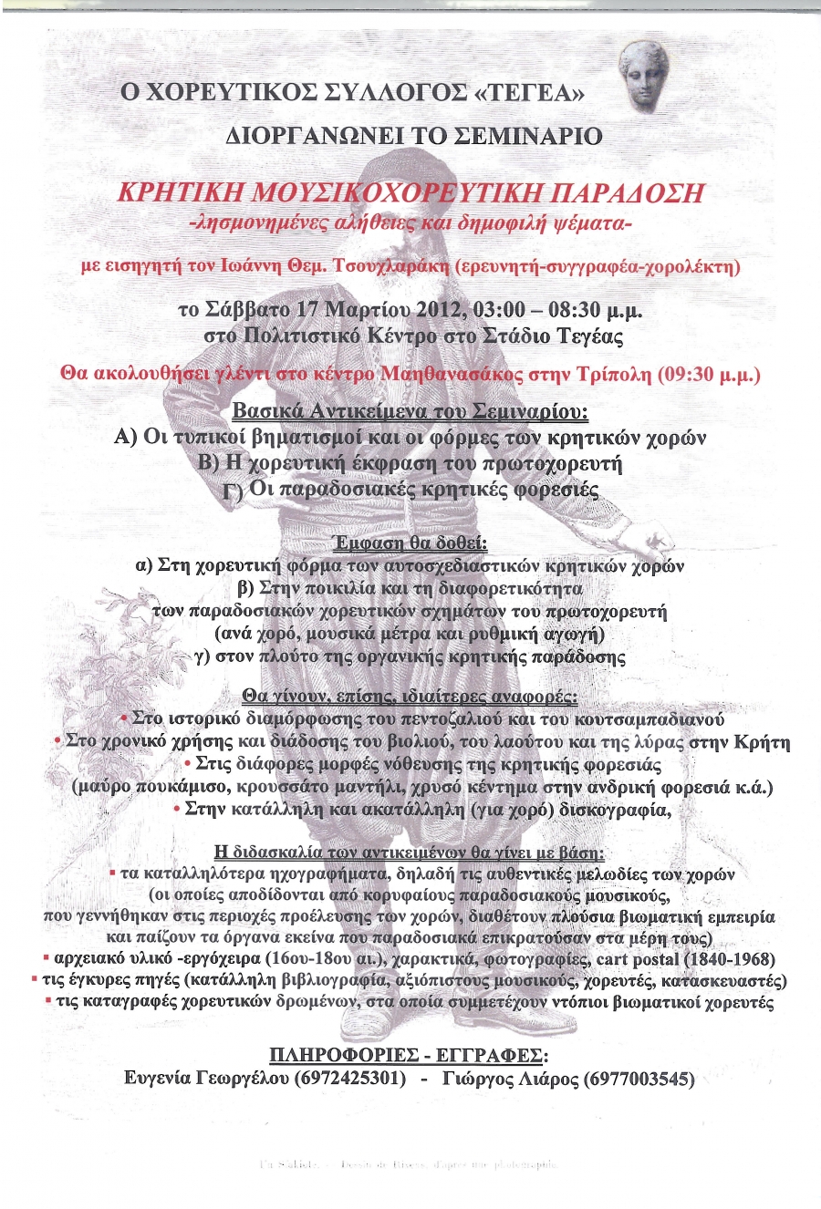 Ο Χορευτικός Σύλλογος "Τεγέα" διοργανώνει σεμινάριο με θέμα "Κρητική μουσικοχορευτική παράδοση -λησμονημένες αλήθειες και δημοφιλή ψέματα", με εισηγητή τον Ιωάννη Θεμ. Τσουχλαράκη (ερευνητή-συγγραφέα-χορολέκτη), το Σάββατο 17 Μαρτίου 2012 από τις 3 έως τις 8.30 μ.μ., στο Πολιτιστικό Κέντρο στο Στάδιο Τεγέας.