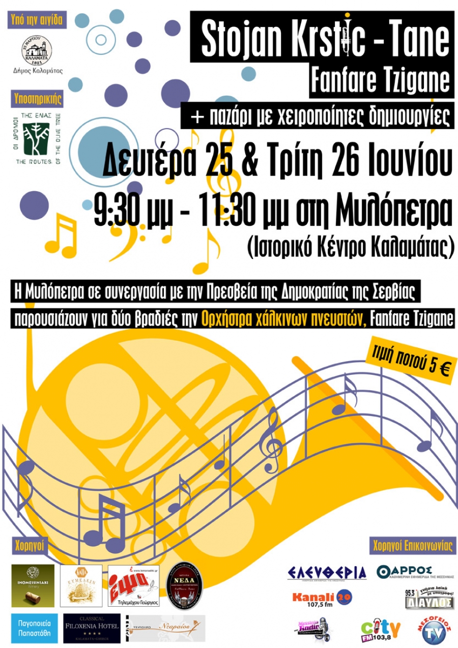 Ο Πολιτιστικός Οργανισμός «Δρόμοι της Ελιάς» και το κατάστημα «Μυλόπετρα» οργανώνουν εκδήλωση με την Ορχήστρα των χάλκινων πνευστών Fanfare Tzigane του Stojan Krstić σε συνεργασία με την Πρεσβεία της Δημοκρατίας της Σερβίας . Η εκδήλωση θα πραγματοποιηθεί επί 2 συνεχείς βραδιές στις 25 και 26 Ιουνίου 2012 (21.00-23.30) στον πεζόδρομο Μπενάκη - Ιστορικό Κέντρο Καλαμάτας. Παράλληλα με την εκδήλωση θα πραγματοποιηθεί παζάρι με χειροποίητες δημιουργίες.