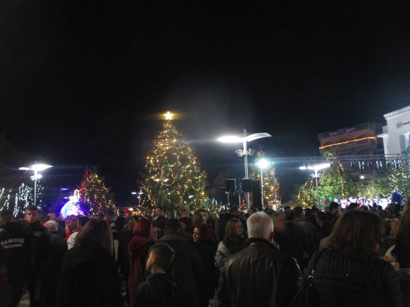 Δημότες κι επισκέπτες γεύτηκαν κεράσματα, προσφορά συλλόγων της πόλης, οι οποίοι είχαν στήσει σε πάγκους χριστουγεννιάτικο παζάρι.