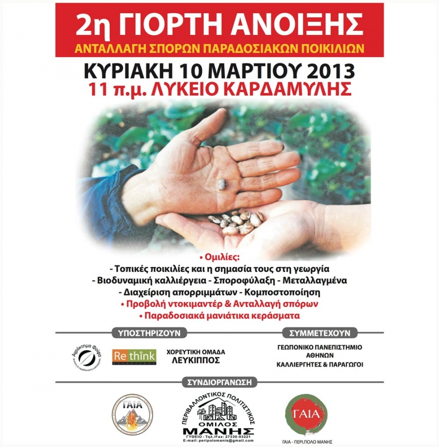 Επίσης θα προβληθεί το ντοκιμαντέρ «Εν αρχή ην ο Σπόρος», και θα γίνει ανταλλαγή και διανομή σπόρων, καθώς και η δημιουργία σχολικού κήπου με παραδοσιακές ποικιλίες.