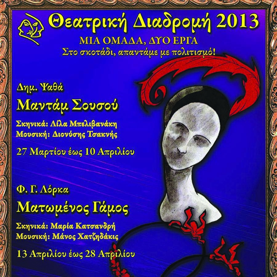 Ξεκινά τις παραστάσεις της την επόμενη Τετάρτη 27 Μαρτίου η "Θεατρική διαδρομή" με τη "Μαντάμ Σουσού" του Δ. Ψαθά στο Πνευματικό Κέντρο. Οι παραστάσεις θα ξεκινούν στις 9 το βράδυ και θα ανεβαίνουν καθημερινά εκτός Δευτέρας ως τις 10 Απριλίου. Από τις 13 ως τις 28 Απριλίου η ομάδα παρουσιάζει το "Ματωμένο γάμο" του Φ. Γ. Λόρκα.