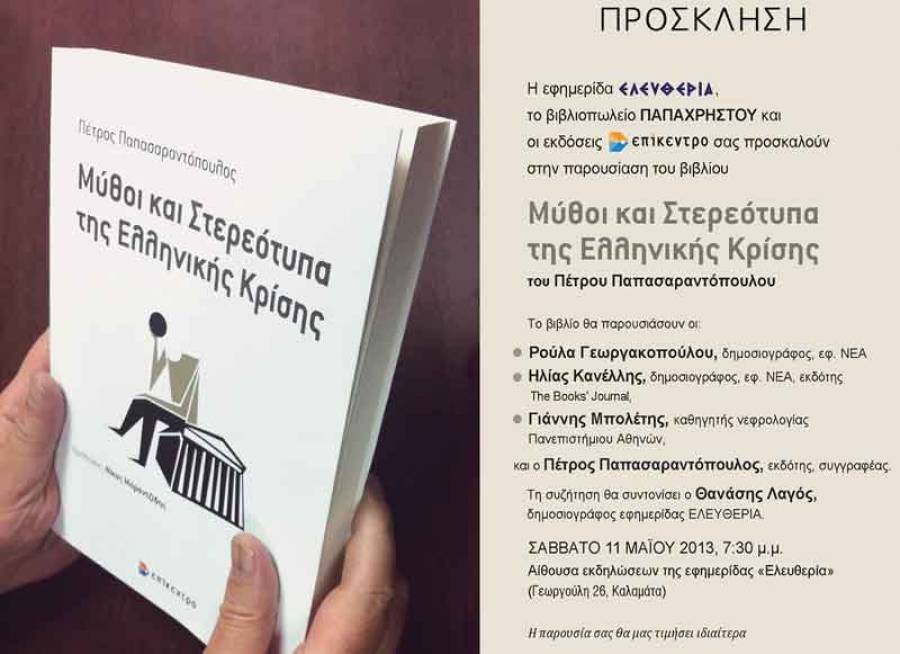 Γράφτηκε από την ΕΛΕΥΘΕΡΙΑ OnlineΤο βιβλίο "Μύθοι και στερεότυπα της ελληνικής κρίσης" του Πέτρου Παπασαραντόπουλου παρουσιάζει η "Ελευθερία" από κοινού με τις εκδόσεις "Επίκεντρο" και το βιβλιοπωλείο "Παπαχρήστου", το Σάββατο 11 Μαΐου στις 7.30 μ.μ., στην αίθουσα εκδηλώσεων της εφημερίδας (Γεωργούλη 26 - 2ος όροφος).