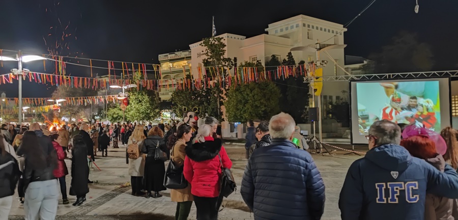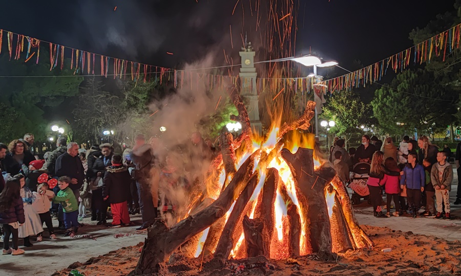 Ολο το βράδυ της Κυριακής, στην κεντρική πλατεία, οι επισκέπτες απολάμβαναν τη μεγάλη φωτιά, με την οποία αναβίωσε φέτος το έθιμο στον Δήμο, ενώ μέσω βιντεοπροβολής μπορούσαν να παρακολουθήσουν στιγμιότυπα από καρναβαλικές εκδηλώσεις προηγούμενων ετών.