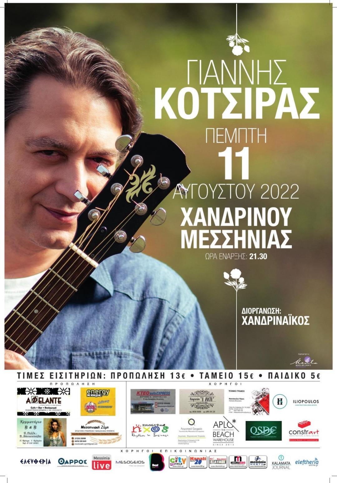 Συναυλία με το Γιάννη Κότσιρα θα πραγματοποιηθεί την Πέμπτη 11 Αυγούστου στις 9.30 μ.μ. στo Χανδρινού του Δήμου Πύλου-Νέστορος, εντός του Δημοτικού πάρκου ‘’Πλατάνια’’.