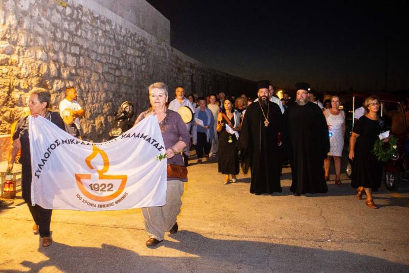 Αφού τελέσθηκε τρισάγιο από τον Πρωτοσύγκελλο της Ιεράς Μητροπόλεως Μεσσηνίας Αρχιμ. Φίλιππο Χαμαργιά "υπέρ αναπαύσεως πάντων των εκ Μικράς Ασίας, Πόντου, Κωνσταντινουπόλεως και Καππαδοκίας προερχομένων πατέρων, πάππων και προππάπων ημών, των ενταύθα αφιχθέντων και μεγαλουργησάντων" όπως χαρακτηριστικά μνημόνευσε, εν συνεχεία οι απόγονοι των προσφύγων έγραψαν τα ονόματα των προγόνων τους σε χάρτινα καραβάκια και μαζί με άνθη τα έριξαν στη θάλασσα. Η συμβολική αυτή κίνηση συγκίνησε τον κόσμο που βρέθηκε στο σημείο. Η συγκίνηση δε κορυφώθηκε, όταν ο Πρωτοσύγκελλος μιλώντας για τους δικούς του προγόνους ανέφερε ότι η αείμνηστη προγιαγιά του, ερχόμενη από την Κρήνη της Μικράς Ασίας έφερε μαζί της ως θησαυρό δύο εικόνες και την πιατέλα που έφτιαχνε κόλλυβα στους δικούς της προγόνους. Η εκδήλωση έκλεισε με μικρασιάτικα τραγούδια από την χορωδία του Συλλόγου Μικρασιατών Καλαμάτας.