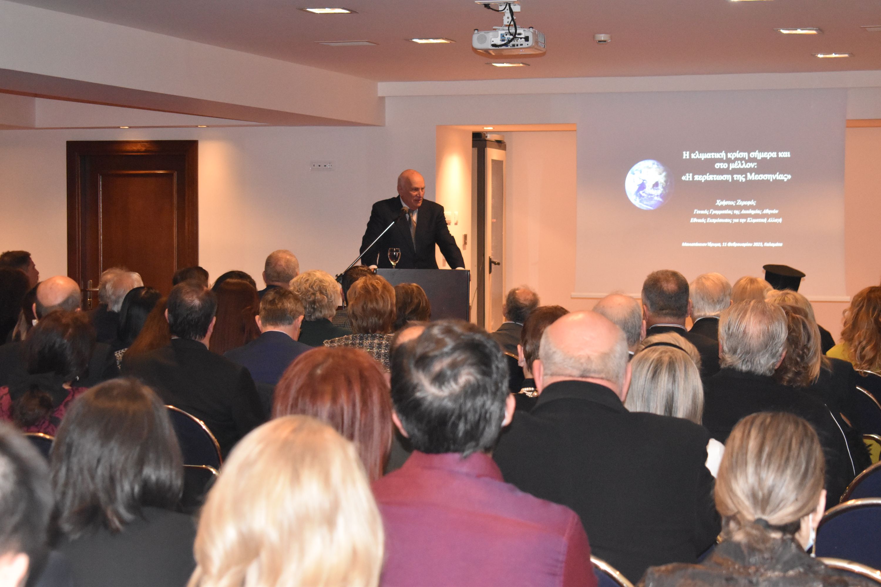 Ακολούθως ο κύριος ομιλητής της βραδιάς καθηγητής - ακαδημαϊκός Χρ. Ζερεφός ανέλυσε διεξοδικά της τραγικές συνέπειες της Κλιματικής Κρίσης στο πλανήτη αλλά και τις αντίστοιχες συνέπειες στην Ελλάδα και στην Πελοπόννησο. Με προβολή εικόνων και στοιχείων έδειξε το τι θα συμβεί στο μέλλον αν δεν αποσυρθούν οι ορυκτές πηγές ενέργειας και δεν αντικατασταθούν με ανενεώσιμες πηγές ενέργειας.