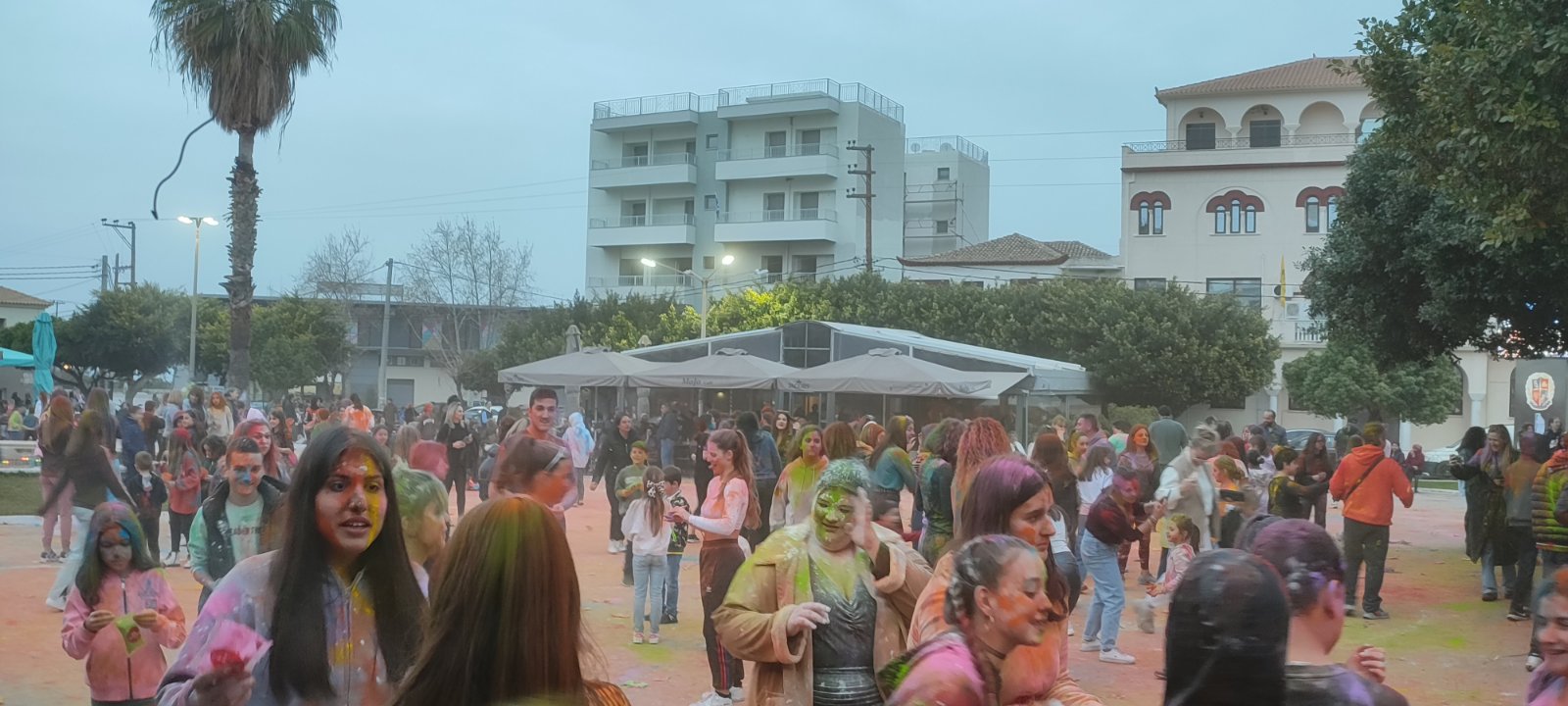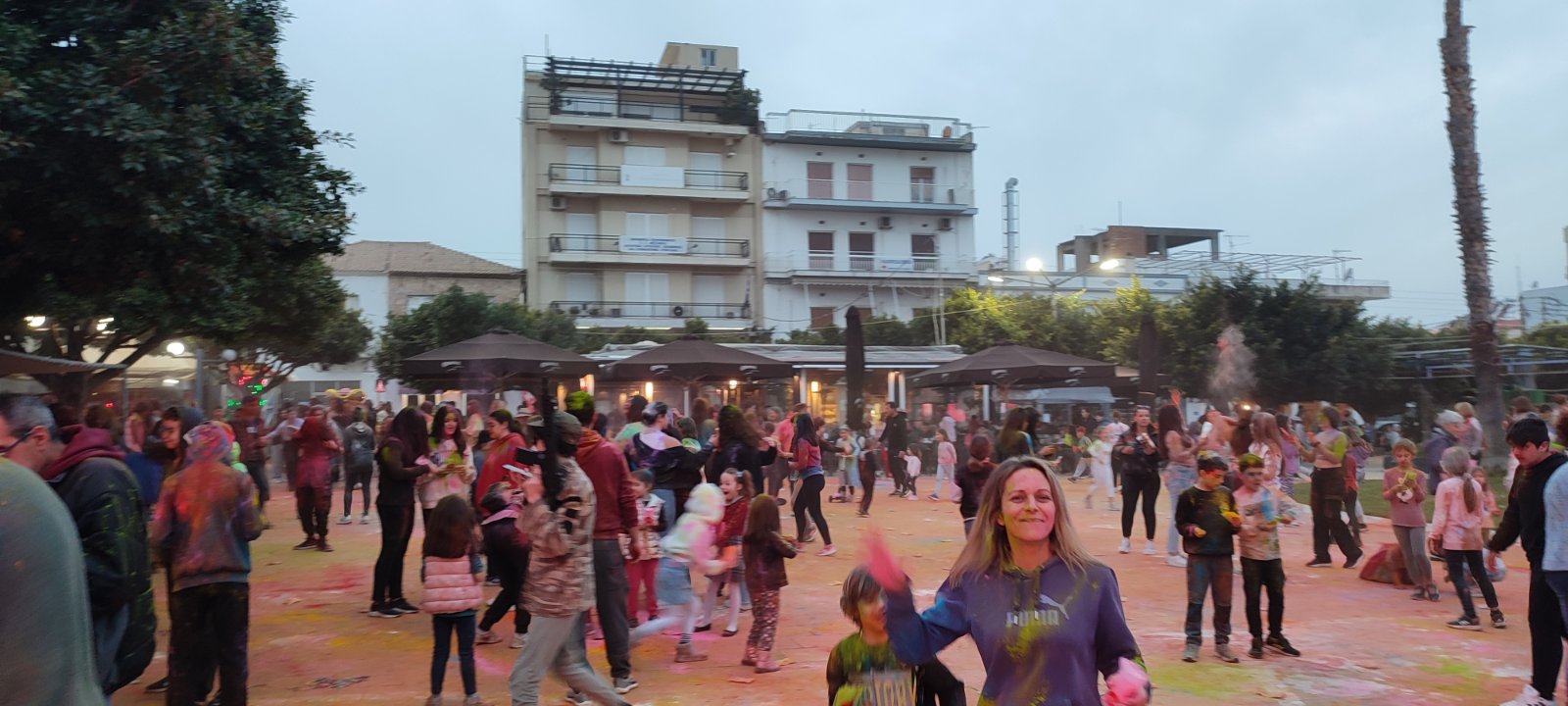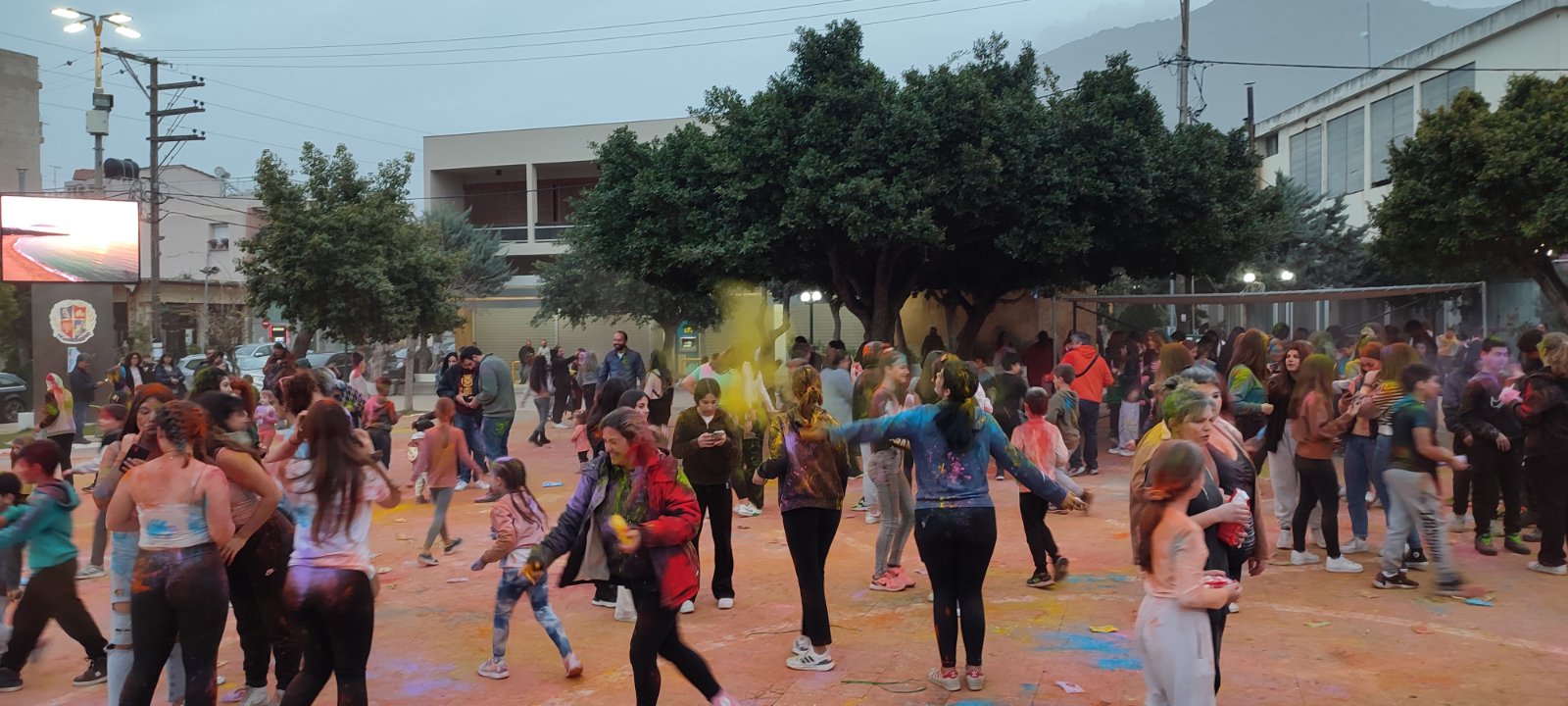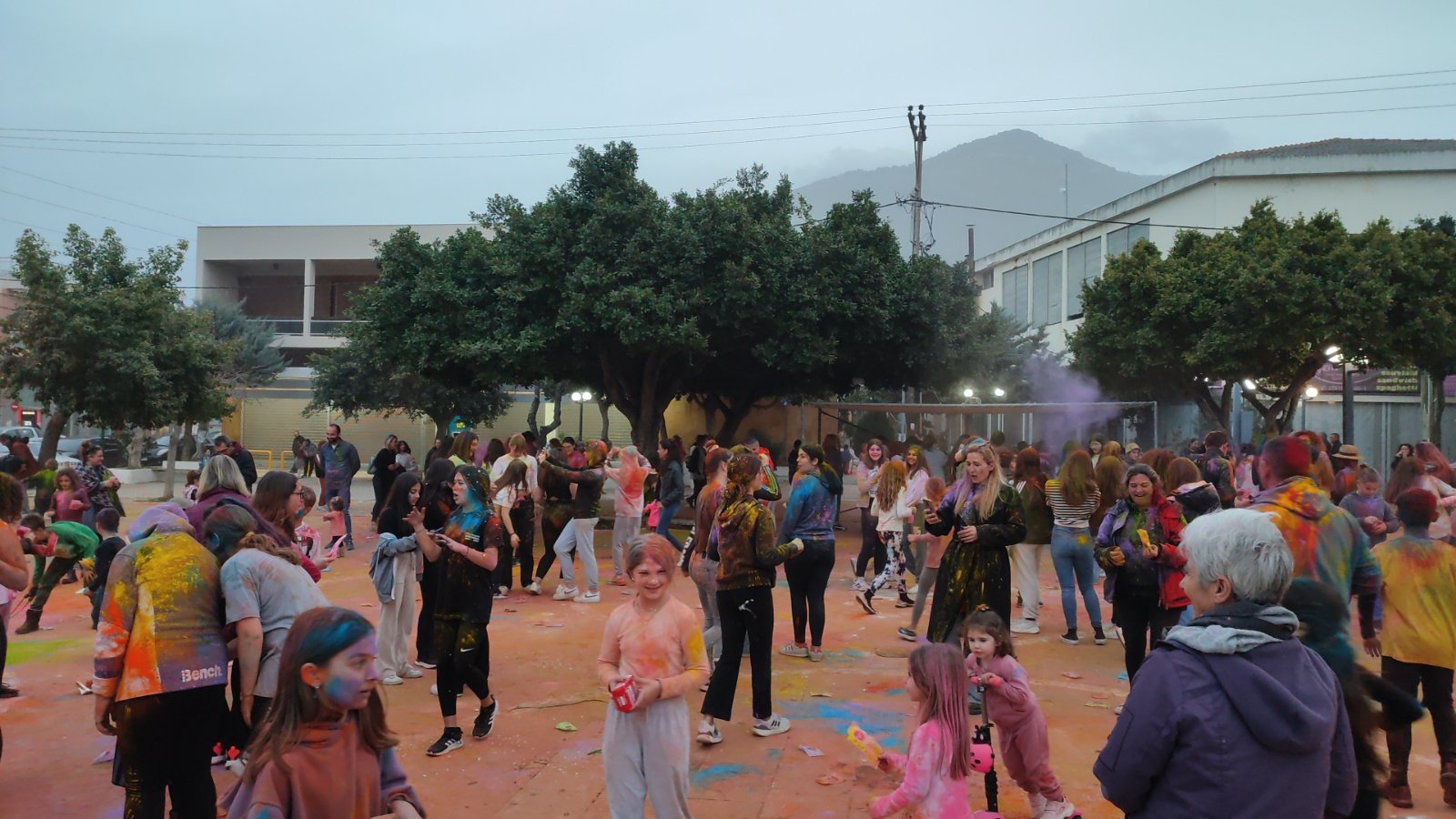 Η ιδιότυπη... μάχη χρωμάτων διοργανώθηκε με μέριμνα του Εμπορικού Συλλόγου Κυπαρισσίας και συμμετείχαν μικροί και μεγάλοι με την πλατεία να "πλημμυρίζει" από κόσμο και χρώματα.