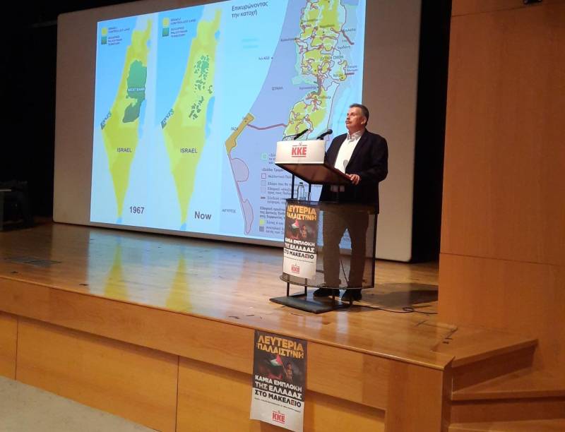 Ανέφερε πως “οι κομμουνιστές βρέθηκαν στη σωστή μεριά της Ιστορίας, μαζί με όλους τους αγωνιστές, που συμπορεύονται με το κόμμα μας, και βγαίνουν στους δρόμους, ενάντια σε αυτό το μεγάλο έγκλημα, που διεξάγεται στην Παλαιστίνη, όπως κάνουν εκατοντάδες χιλιάδες, εκατομμύρια λαού σε πολλές χώρες, που διαδηλώνουν με το σύνθημα «Λευτεριά στην Παλαιστίνη!», απαιτώντας τον τερματισμό της κατοχής, του παράνομου εποικισμού, του καθεστώτος «απαρτχάιντ»”.