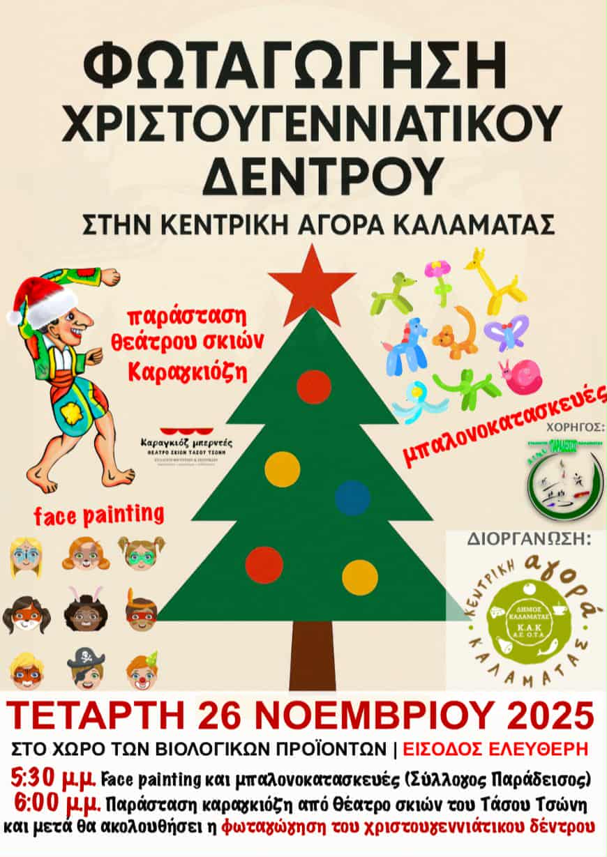 Εορταστική εκδήλωση για τη φωταγώγηση του Χριστουγεννιάτικου δέντρου και του εορταστικού φωτισμού στην Κεντρική Αγορά Καλαμάτας θα πραγματοποιηθεί την Τετάρτη 26 Νοεμβρίου.