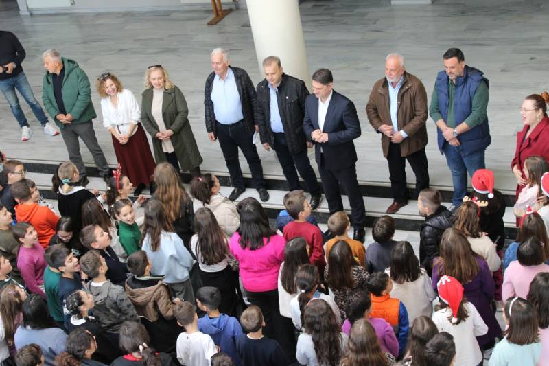 Μαθητές όλων των τάξεων, συνοδευόμενοι από τους δασκάλους τους, συγκεντρώθηκαν στο ισόγειο και με τα τραγούδια και τις παιδικές φωνές τους γέμισαν τον χώρο με γιορτινή ατμόσφαιρα.