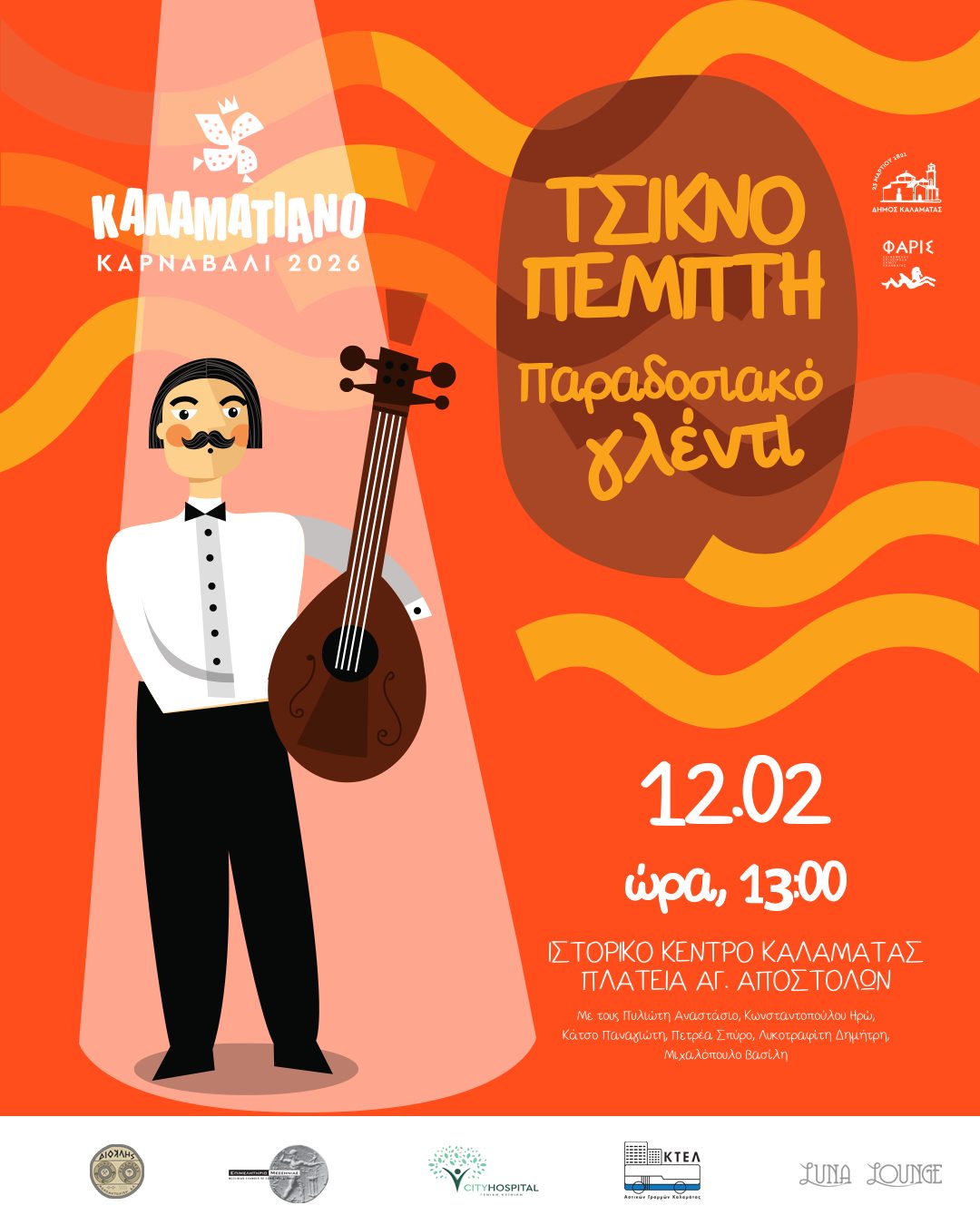 Στο Ιστορικό Κέντρο, καιρού επιτρέποντος, στη 1 το μεσημέρι -και όχι στις 2 που είχε ανακοινωθεί- έχει προγραμματιστεί γλέντι στην πλατεία Αγίων Αποστόλων, στο πλαίσιο της οποίας ορχήστρα θα διασκεδάσει το κοινό.
