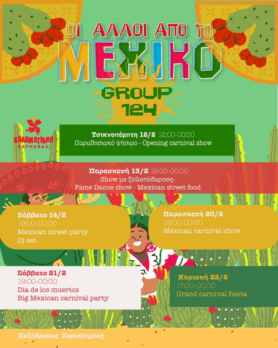 Οι εκδηλώσεις συνεχίζονται και κορυφώνονται την επόμενη εβδομάδα με το ακόλουθο πρόγραμμα: σήμερα στις 8 μ.μ. θα πραγματοποιηθεί show με ξυλοπόδαρους, Fame dance show και Mexican street food, το Σάββατο 14 Φεβρουαρίου στις 8 μ.μ. Mexican street party με dj set, την Παρασκευή 20 Φεβρουαρίου την ίδια ώρα Mexican carnival show, το Σάββατο 21 Φεβρουαρίου και πάλι στις 8 μ.μ. το Día de los Muertos – Big Mexican carnival party και την Κυριακή 22 Φεβρουαρίου στις 6 μ.μ. η Grand carnival fiesta.