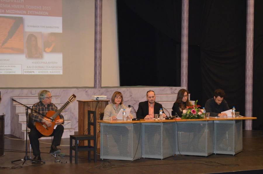 Σύμφωνα με τη σχετική ανακοίνωση, η πρώτη εκδήλωση -για την Παγκόσμια Ημέρα Ποίησης- έγινε τη Δευτέρα 16 Μαρτίου στο Πνευματικό Κέντρο Καλαμάτας με προσκεκλημένο τον διδάκτορα Γλωσσολογίας, μεταφραστή αγγλικής γλώσσας και λογοτεχνίας Δημήτρη Θανασούλα, ενώ ποιήματά τους απήγγειλαν οι νεαροί ποιητές Κατερίνα Αυγέρη και Θωμάς Τσαλαπάτης.
