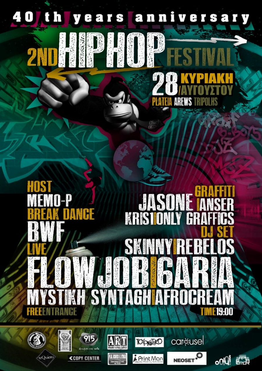 Την Κυριακή 28 Αυγούστου και ώρα 7 μ.μ. ξεκινάει στην πλατεία Αρεως Τρίπολης το 2ο Hip Hop festival με κύριο θέμα τον εορτασμό των 40 χρόνων της Hip Hop κουλτούρας. Σκοπός του φεστιβάλ είναι να παρουσιάσουμε τα 4 στοιχεία της Hip Hop: Breakdance, Graffiti, Mc-ing, Dj-ing όπως τα ένωσε το 1971 ο Dj Kool Herc(ο πατέρας της Hip Hop), καθώς και τα φιλοσοφικά διδάγματα που οι παλιοί περνούσαν μέσω της Hip Hop, τα peace,love,unity and brotherhood.