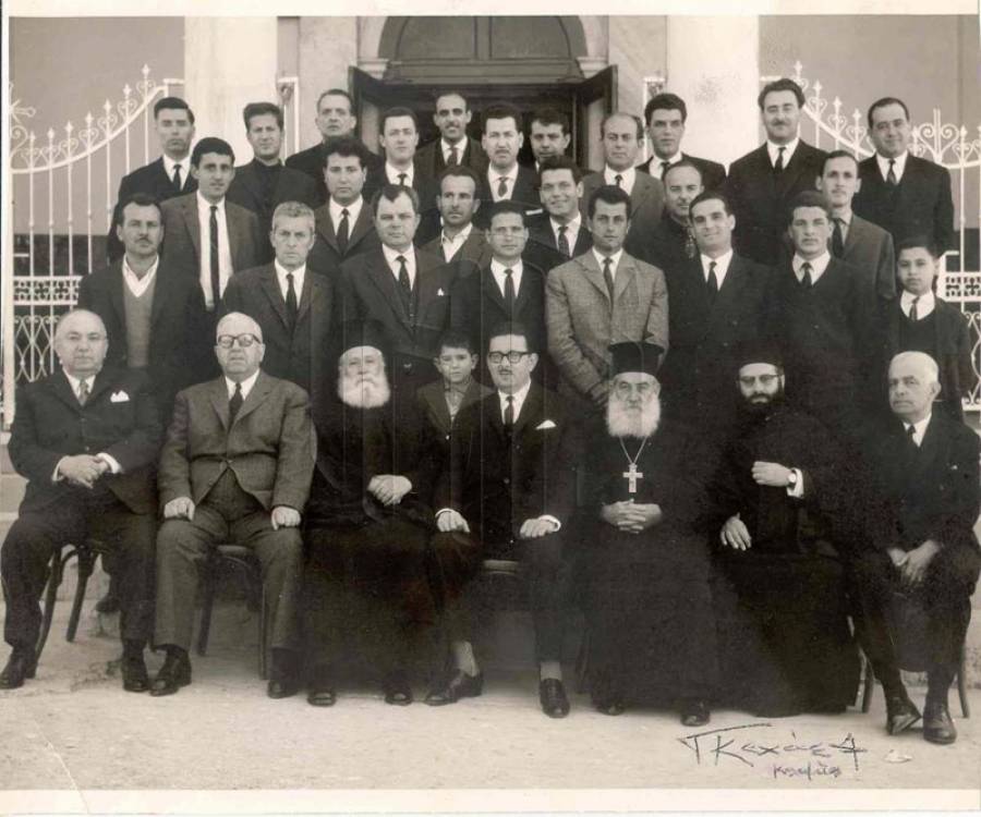 Από αριστερά προς τα δεξιά: Στην πρώτη σειρά (καθιστοί): επίτροπος Παν. Μπουφέας, επίτροπος Γεώργιος Ζουζανέας, ο ιερέας Γεωργαράκης, ο μικρός γιος του Σπύρου Μαυρά, Κώστας, ο μαέστρος της χορωδίας Θεόδωρος Μουτεβελής, ο ιερέας Καίσαρης, ο διάκος Ξανθάκης, ο επίτροπος Γεώργιος Βασιλάκης.