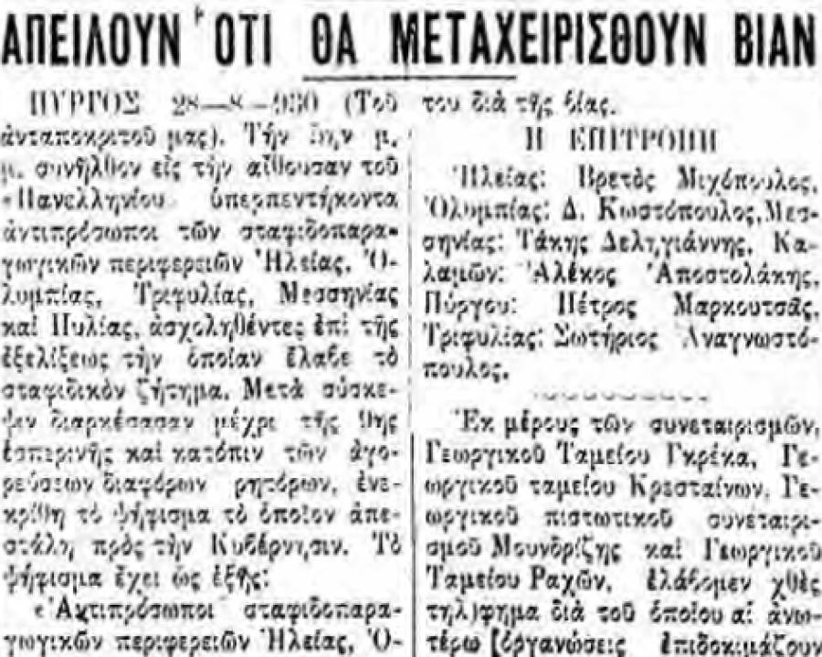 “Αντιπρόσωποι σταφιδοπαραγωγικών περιφερειών Ηλείας, Ολυμπίας, Τριφυλίας, Μεσσηνίας, Καλαμών και Πυλίας, συνελθόντες εις πολύωρον σύσκεψιν κατόπιν εντολής των περιφέρειών των, αξιούσι την άμεσον απομάκρυνσιν του διευθυντού και της διοικήσεως του ΑΣΟ ως και των λοιπών πλοκάμων αυτών, συνεταιριστικών υπαλλήλων κ.λπ. και ζητούσιν την ποινικήν των δίωξιν.