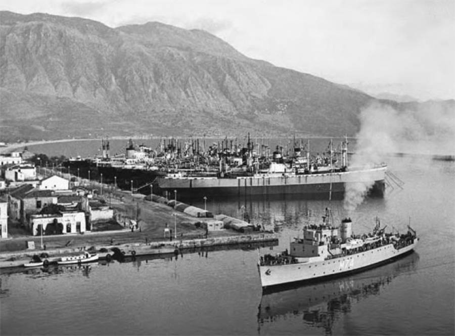 Πολεμικό πλοίο κατευθύνεται στη δυτική προκυμαία, ενώ διακρίνεται η διαμόρφωση των κτισμάτων στη γωνία Μιαούλη και Ναυαρίνου.