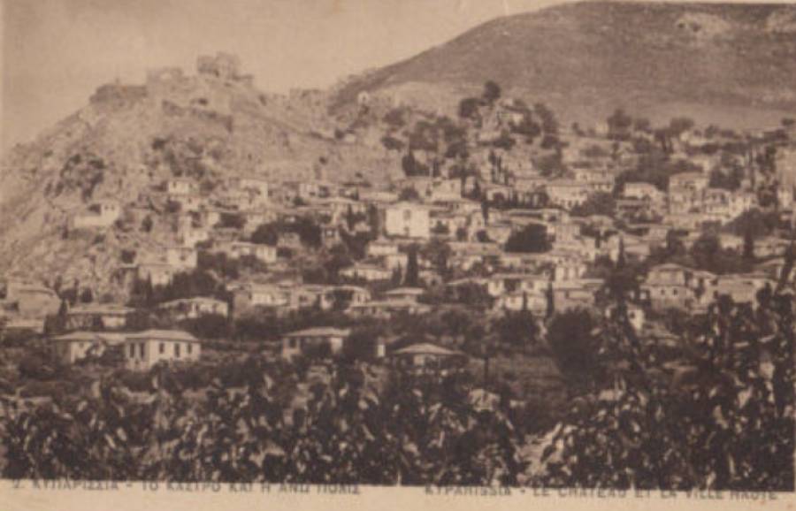 Μια εικόνα της Κυπαρισσίας με το κάστρο και την Ανω Πόλη, όπως γράφει η καρτ ποστάλ, τη δεκαετία του 1920.