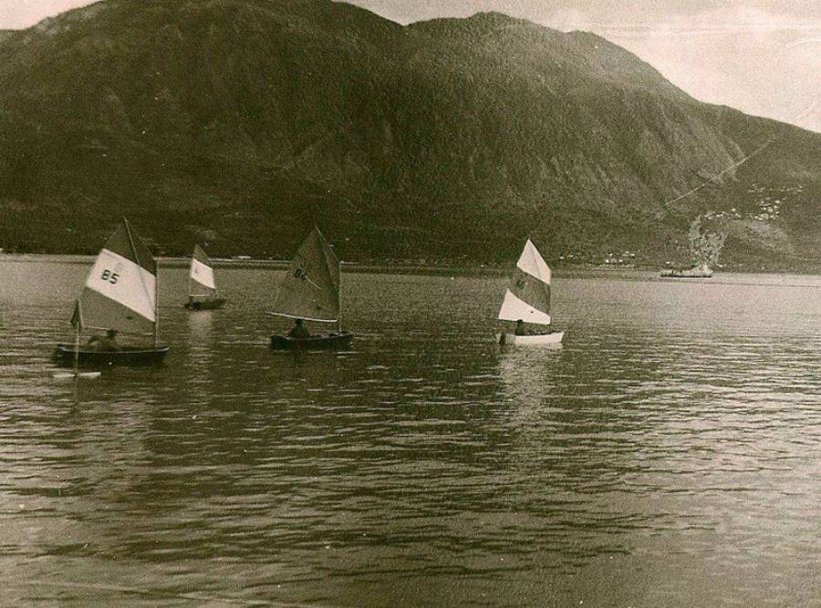 Σκάφη τύπου Optimist το 1968, με φόντο το Καλάθι και τα λιγοστά σπίτια που είναι σκαρφαλωμένα πάνω του.