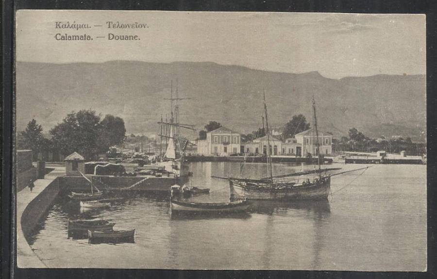 Το λιμάνι της Καλαμάτας στις αρχές του 20ού αιώνα. Εχει κατασκευαστεί το συγκρότημα του Τελωνείου (1911), όχι όμως και οι μύλοι "Ευαγγελίστρια" (1926).