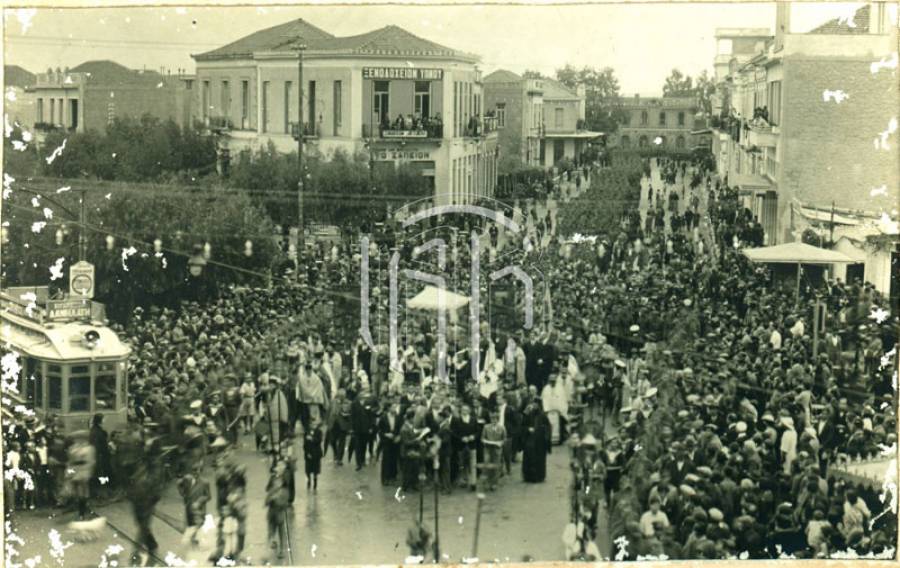 Στη φωτογραφία διακρίνονται μεταξύ άλλων το ξενοδοχείο ύπνου «Ακταίον», καθώς και το τραμ με τη διαφημιστική πινακίδα «Σιγαρέττα Δαμηλάτη». Η φωτογραφία του 1936, στη διασταύρωση των οδών Σιδηροδρομικού Σταθμού και Αριστομένους.