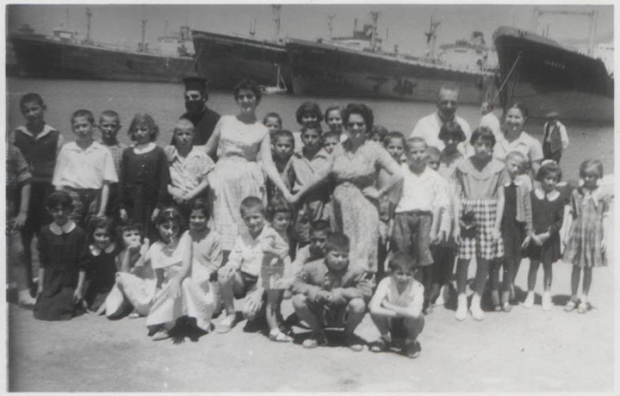 Πιθανολογούμε ότι πρόκειται για σχολείο της πόλης. Πάντα η Παραλία ήταν... προορισμός για μαθητές. Η φωτογραφία έχει ημερομηνία 22 Μαΐου 1960.