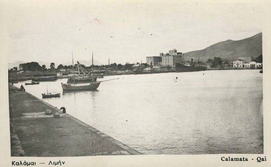 Το λιμάνι της Καλαμάτας, πιθανόν τη δεκαετία του 1930. Η λήψη έχει γίνει από τον αντιβραχίονα και απαθανατίζονται οι μύλοι "Ευαγγελίστριας" και Φεραδούρου-Αποστολάκη, όπως και οι εγκαταστάσεις του Τελωνείου.