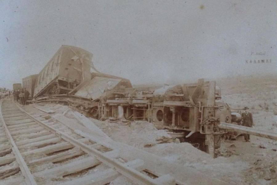 Η φωτογραφία απαθανατίζει ένα παλιό σιδηροδρομικό ατύχημα. Σύμφωνα με τη λεζάντα που την συνοδεύει στο ηλεκτρονικό δημοπρατήριο eBay, το ατύχημα είχε συμβεί κοντά στην Καλαμάτα.
