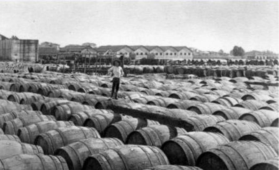Βαρέλια, χιλιάδες βαρέλια με κρασί, μια κοπέλα πάνω σε αυτά και πίσω οι εγκαταστάσεις.