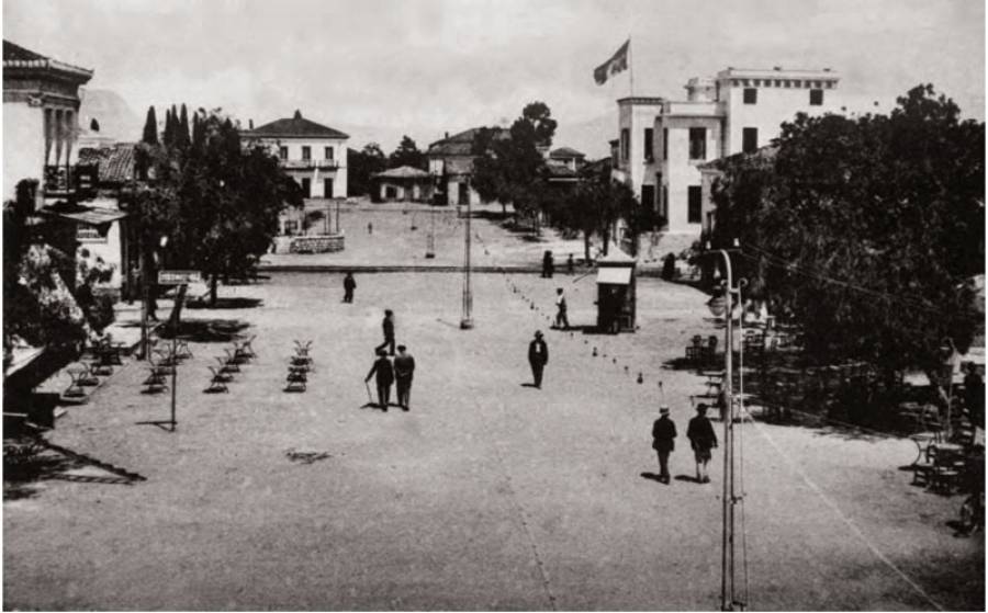 Αριστερά πίσω από τα δέντρα τα "δημοτικά μαγαζιά" κάλυπταν τη νοτιοδυτική γωνία και κατεδαφίστηκαν αργότερα. Μπροστά από αυτά η εξέδρα της Φιλαρμονικής (κατεδαφίστηκε το 1931), τραπεζάκια έξω στην κάτω πλατεία, περίπτερο δεξιά και το νεόδμητο κτήριο της Εθνικής Τράπεζας και Νησιώτες σε πρωινή βόλτα (όπως... προδίδουν οι σκιές)