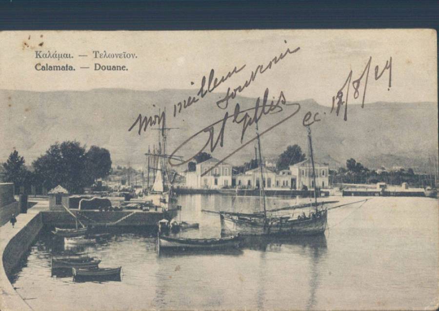 Το λιμάνι της Καλαμάτας στα τέλη της δεκαετίας του 1920, καθώς η καρτ-ποστάλ έχει μήνυμα με ημερομηνία 17/8/1929.