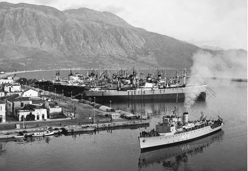 Μια εικόνα από το λιμάνι της Καλαμάτας τη δεκαετία του 1950 και την περίοδο αποκλεισμού του Σουέζ, όπως φαίνεται από τα πλοία που έχουν δέσει το ένα δίπλα στο άλλο περιμένοντας την άρση του αποκλεισμού.