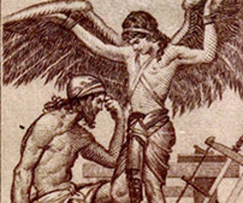 Ο Δαίδαλος και ο έφηβος γιος του Ικαρος είχαν την ίδια ακριβώς κακή τύχη με τους νέους και τις νέες από την Αθήνα. Κλείστηκαν από τον Μίνωα στον σκοτεινό Λαβύρινθο, γιατί ο βασιλιάς της Κρήτης πίστεψε, σύμφωνα με κάποια εκδοχή του μύθου, πως είχαν βοηθήσει την σύζυγό του Πασιφάη να ενωθεί ερωτικά με τον «ωραίο ταύρο» και να γεννήσει το Μινώταυρο. Πατέρας και γιος κατάφεραν εντούτοις να διαφύγουν από το Λαβύρινθο, πετώντας με φτερά που κατασκεύασε ο μεγάλος τεχνίτης και τα συγκόλλησε στο σώμα τους με κερί (Εικ.1: Δαίδαλος κατασκευάζει φτερά Ικαρου. Γρμματόσημο). Ο ίδιος κατευθύνθηκε δυτικά προς την Κάτω Ιταλία και τη Σικελία, ενώ ο Ικαρος πέταξε προς τα ανατολικά. Γοητευμένος από την πτήση, που πάντα λαχταρούνε οι θνητοί, λησμόνησε ο νέος την πατρική συμβουλή να μην πλησιάζει τον Ηλιο, με αποτέλεσμα να λιώσει το κερί από τη θερμότητα, να αποκολληθούνε τα φτερά του και να καταπέσει ο άτυχος Ικαρος στο πέλαγος. Ο τραγικός θάνατός του είναι αντίστοιχος με το θάνατο του νεαρού Φαέθοντα, του απερίσκεπτου γιου του Ηλιου. Το πτώμα του Ικαρου εκβράστηκε στις ακτές ενός μακρόστενου νησιού, της Μάκρης ή Δολίχης ή αλλιώς Ιχθυόεσσας, η οποία μετονομάστηκε έκτοτε σε Ικαρία από τον αδικοχαμένο Ικαρο.