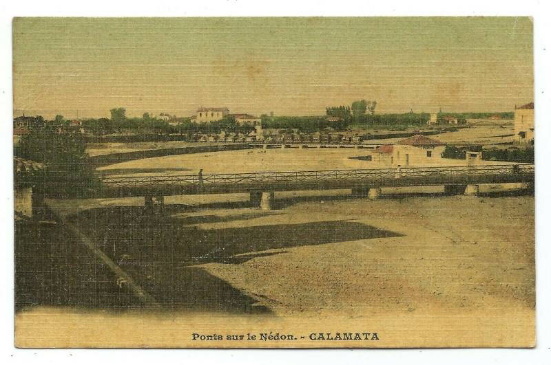 Τρεις γέφυρες στο Νέδοντα, με πρώτη τη γέφυρα Σταματελάκη ή καροτσαρέικη, γύρω στα 1900. [Από καρτ ποστάλ στο eΒay]