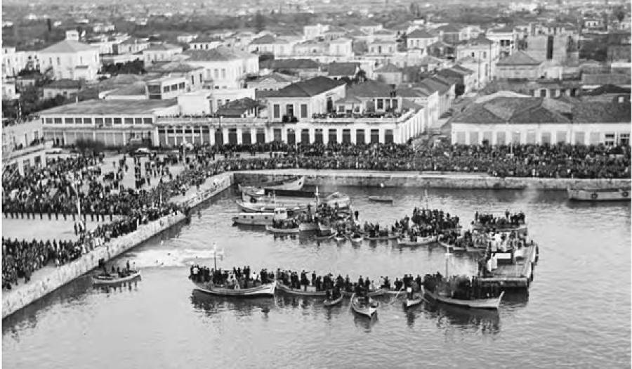 Η γιορτή του αγιασμού των υδάτων τη δεκαετία του 1960. Κόσμος συγκεντρωμένος γύρω από το λιμάνι.