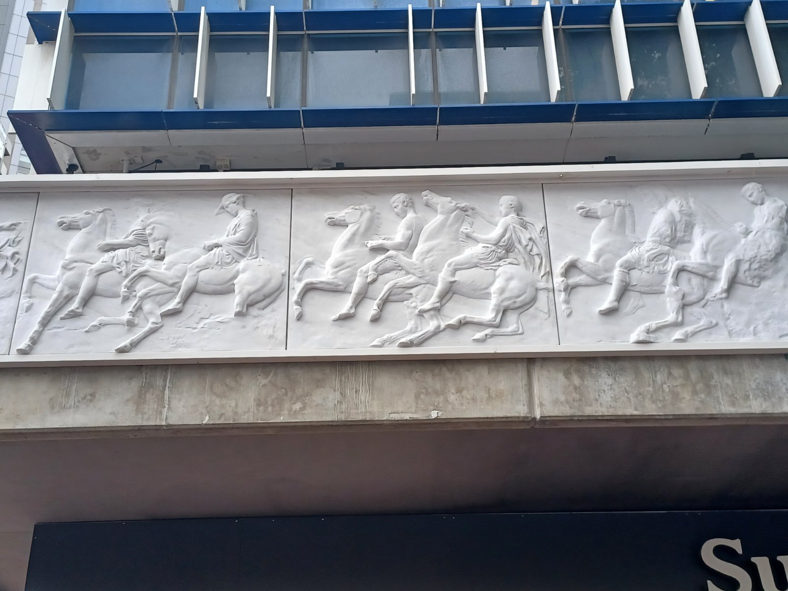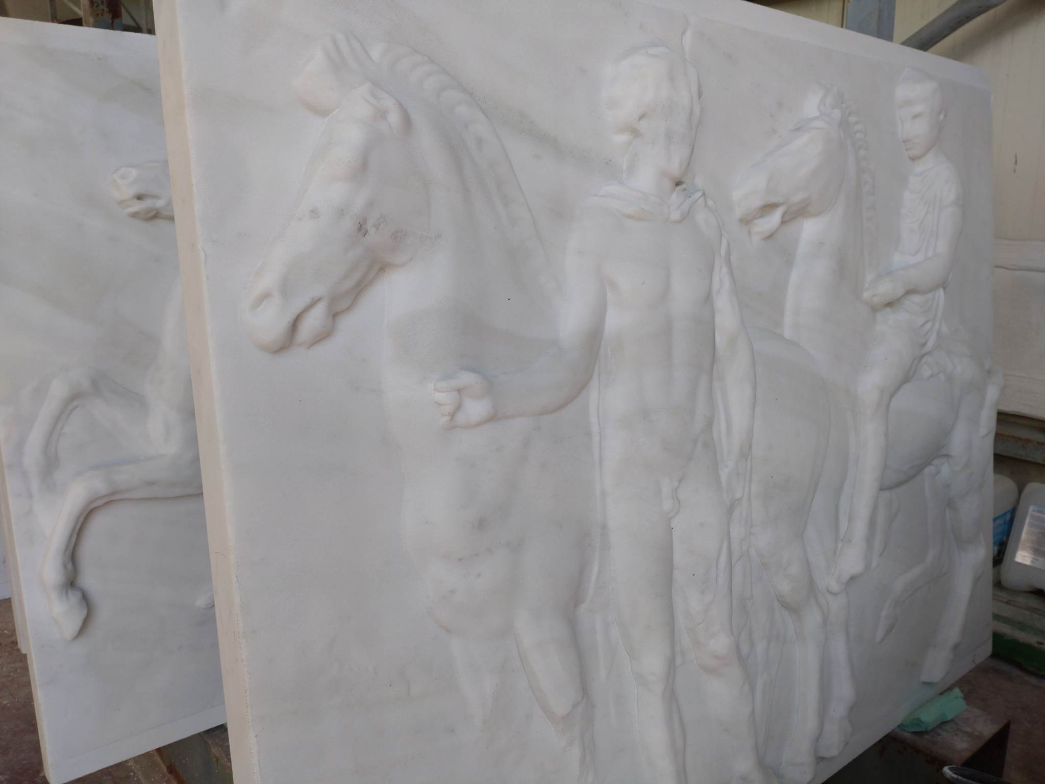 «Στο κτήριο της Ελληνικής Κοινότητας τοποθετήθηκαν μη ακριβή αντίγραφα -κατά 10% μεγαλύτερα από τα πραγματικά- των 14 λίθων που βρίσκονται στην Ελλάδα, ενώ αντί των αντιγράφων αυτών που βρίσκονται στη Βρετανία υπάρχουν δύο κενοί λίθοι χωρίς τις ανάγλυφες μορφές για ευνόητους λόγους. Για τα αντίγραφα επιλέχθηκαν τα κατάλληλα κομμάτια μαρμάρου από το λατομείο του Διονύσου» σημείωσε, τονίζοντας πως η άμεση ανταπόκριση του υπουργείου Πολιτισμού ήταν ίσως η πιο γρήγορη στα χρονικά για ένα έργο σαν αυτό.